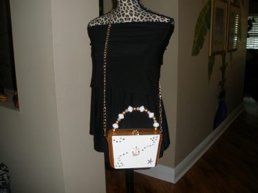 Perfect for a cruise, beach wedding or beach vacation, this Ship to Shore cigar box purse is the perfect summer accessory! The front of this upcycled cigar box handbag has been painted white and a pretty crystal starfish brooch and a gold with crystal anchor brooch have been attached along with a splattering of clear crystals- so pretty and feminine! The back has been painted black.  I flipped the cigar box purse so that the opening is now on the top and gave it a gold ball lock closure for security. Gold  purse feet have been added to the back and bottom for protection.  Gold hardware has been attached to the sides so that you may add a strap that you already own. This makes these little cigar box purses of mine versatile in that they can be worn by the handle, over the shoulder or cross- body. I sell straps and gold and silver cross body chains too. The chain in the last photo is available, but not included.  The interior has the original black velvet bottom and beautiful red velvet Fuente label on the inner lid and I added white lace trim.  The handle is made up of gorgeous white, gold,  and crystal beads . 5.25 x 8(top) / 7.25(bottom) x 3.25″. By the way, I LOVE to use these Best Seller cigar boxes because they are the perfect size and shaped like a little purse! THIS IS AN AUTHENTIC CIGAR BOX PURSE, SO SMALL FLAWS INFLICTED BY THE SMOKERS OF THE CIGARS ARE TO BE EXPECTED!  Large flaws will be noted in the description. If you don’t like what you see, I can do custom cigar box purses and can include anything you like!- pictures of family members, pets, places- you name it! I always ship insured. Feel free to call me! 813-655-8003