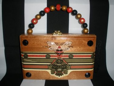 This classic, Ashton, Virgin Sun Grown cigar box purse has been left pretty much authentically as is with the exception of a designer (Gucci) inspired, upcycled bee brooch that has been added to the front. Four black crystals frame the bee brooch. The cigar box itself is a blonde, wooden cigar box with dovetail detailing in the corners and beautiful red, black and gold labels to include lions, crown and crest that wraps around to the back of the box. The back has been painted black and sealed. I adorned the inside with padded black velvet and black lace. The handle is made up of lovely gold, red, black and red crystal beads and a black tassel- so pretty!  The cigar box has been flipped so that the opening is now on the top  and has been given a gold three ball lock for security. Eight gold purse feet have been added to the back and bottom for protection. Gold hardware has been attached to the sides so that you may add a strap that you already own. This makes these little cigar box purses of mine versatile in that they can be worn by the handle, over the shoulder or cross- body. I sell straps and gold and silver cross body chains too. The chain in the last photo is available, but not included. 6.25 x 9.5 x 2.25″ ** THIS IS AN AUTHENTIC CIGAR BOX PURSE, SO SMALL FLAWS INFLICTED BY THE SMOKERS OF THE CIGARS ARE TO BE EXPECTED! They only add character and charm! Large flaws will be noted in the description. ** Please note: there is a small gap in the opening which is fairly normal with these boxes. This would and does not bother me in the least, but if you are super picky, this may not be the one for you.  If you don’t like what you see, I can do custom cigar box purses and can include anything you like!- pictures of family members, pets, places- you name it! I always ship insured. Feel free to call or text me with questions. 813-416-7071  Please sign up for email via this site to get in on sales and new products. Also please follow Humadorables by Susan on Facebook and Instagram.  https://www.facebook.com/Humadorables/     https://www.instagram.com/humadorablebysusan/