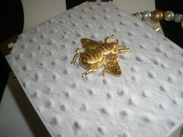 Not for the shy, compliments guaranteed. Oh these are so popular! I wish I could find these white cigar boxes all the time but it’s just not possible! When I’m busy doing shows, these never make it to my website. At this moment I have two- this one and a bigger one (see pics).I took a white, wooden, GTO cigar box and decoupaged the front with a white ostrich image. A darling golden bee finding has been placed right in the center- so pretty! The front of the upcycled cigar box purse has been given gold corner protectors. The back of the cigar box purse has been painted black and sealed. The cigar box has been flipped so that the opening is now on the top and has been given a gold three ball lock for security. Gold purse feet have been added to the back and bottom for protection. Gold hardware has been attached to the sides so that you may add a strap that you already own. This makes these little cigar box purses of mine versatile in that they can be worn by the handle, over the shoulder or cross- body. I sell straps and gold and silver cross body chains too. The chain in the last photo is available, but not included. The interior has been lined in padded leopard fabric and has the original GTO crown and tobacco leaf logo on the inner lid. The handle is made up of gorgeous  gold and silver and pearl beads and a white vegan leather tassel. The original orange seal has be left intact for authenticity sake.  5.75 x 7 x 3.25″ THIS IS AN AUTHENTIC CIGAR BOX PURSE, SO SMALL FLAWS INFLICTED BY THE SMOKERS OF THE CIGARS ARE TO BE EXPECTED! Large flaws will be noted in the description.** Please note, this box has a small tear on the inner label in the upper right corner where the Surgeon General’s warning was removed. If you don’t like what you see, I can do custom cigar box purses and can include anything you like!- pictures of family members, pets, places- you name it! I always ship insured. Feel free to call me! 813-655-8003- Home. Please sign up for email via this site to get in on sales and new products. Also please follow Humadorables by Susan on Facebook and Instagram.  https://www.facebook.com/Humadorables/     https://www.instagram.com/humadorablebysusan/