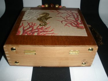 I absolutely love this little seahorse cigar box purse! I decoupaged this beautiful coral image onto a brown, wooden, Cameroon Grand, Torpedo cigar box and added one of my little golden seahorse findings- so simple yet so stunning. The beaded handle is made up of gold, coral and a big brown wooden bead in the center along with a brown tassel. The interior has been lined with padded black velvet and gold trim and even the lid is finished with a lovely tapestry fabric and gold trim! The cigar box has the original tan seal- left for authenticity sake and has dovetail detailing in the corners. I flipped the box so that the opening is now on the top and added a gold three ball lock for security. I painted the back black and gave it a protective coating. Eight gold purse feet have been added to the back and bottom for protection. Gold hardware has been attached to the sides so that you may add a strap that you already own. This makes these little cigar box purses of mine versatile in that they can be worn by the handle, over the shoulder or cross- body. I sell straps and gold and silver cross body chains too. The chain in the last photo is available, but not included. 7.25 x 7.25 x 2.75″ THIS IS AN AUTHENTIC CIGAR BOX PURSE, SO SMALL FLAWS INFLICTED BY THE SMOKERS OF THE CIGARS ARE TO BE EXPECTED! They only add character and charm! Large flaws will be noted in the description. If you don’t like what you see, I can do custom cigar box purses and can include anything you like!- pictures of family members, pets, places- you name it! I always ship insured. Feel free to call me! 813-655-8003- Home. Please sign up for email via this site to get in on sales and new products. Also please follow Humadorables by Susan on Facebook and Instagram. https://www.facebook.com/Humadorables/ https://www.instagram.com/humadorablebysusan/