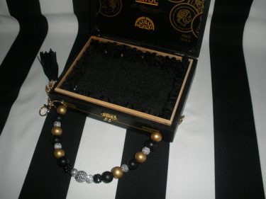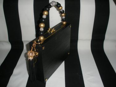 A beautiful , French, Fleur de Lis image has been decoupaged onto a dark brown, wooden Havoc cigar box. The image also includes a crown, key and the word “Paris”- so pretty. The Havoc cigar box, by H. Uppman, has gold coin images in the front and the inner lid. The Surgeon Generals’ warning remains on the inner lid as well. I added a row on rhinestone bling on both sides of the rhinestone image to make it even more special! The handle is made up of black, gold, and silver beads and a black tassel. ** Please note that the tassels will vary and the one in the pictures is no longer available. The inside of the up cycled cigar box purse has been lined with padded black velvet and black lace trim but trim will be gold on going. The cigar box has been flipped so that the opening is now on the top and has been given a gold three ball lock for security. I painted the back black and sealed it. Eight gold purse feet have been added to the back and bottom for protection. Gold hardware has been attached to the sides so that you may add a strap that you already own. This makes these little cigar box purses of mine versatile in that they can be worn by the handle, over the shoulder or cross- body. I sell straps and gold and silver cross body chains too. The chain in the last photo is available, but not included. 7 x 9.5 x 2.5″ ** THIS IS AN AUTHENTIC CIGAR BOX PURSE, SO SMALL FLAWS INFLICTED BY THE SMOKERS OF THE CIGARS ARE TO BE EXPECTED! They only add character and charm! Large flaws will be noted in the description. If you don’t like what you see, I can do custom cigar box purses and can include anything you like!- pictures of family members, pets, places- you name it! I always ship insured. Feel free to call me! 813-655-8003- Home. Please sign up for email via this site to get in on sales and new products. Also please follow Humadorables by Susan on Facebook and Instagram. https://www.facebook.com/Humadorables/ https://www.instagram.com/humadorablebysusan/