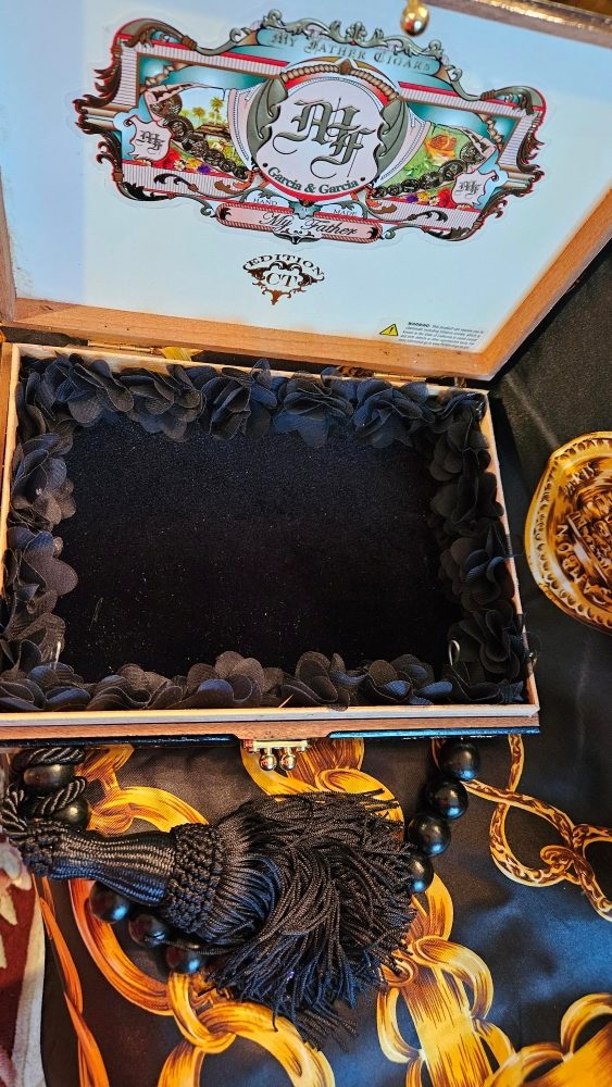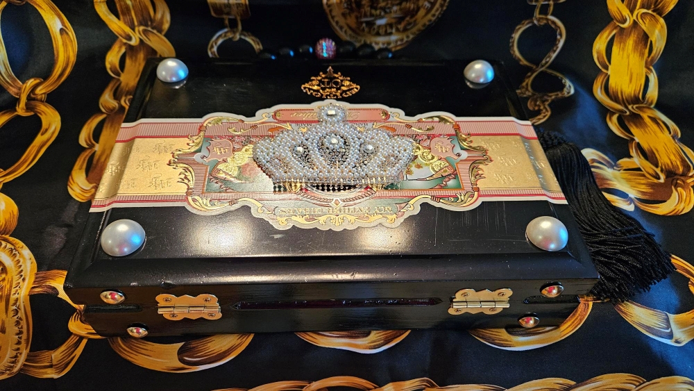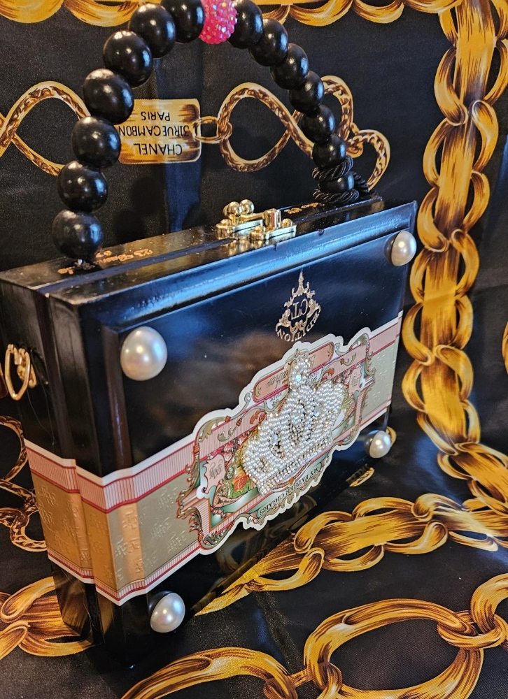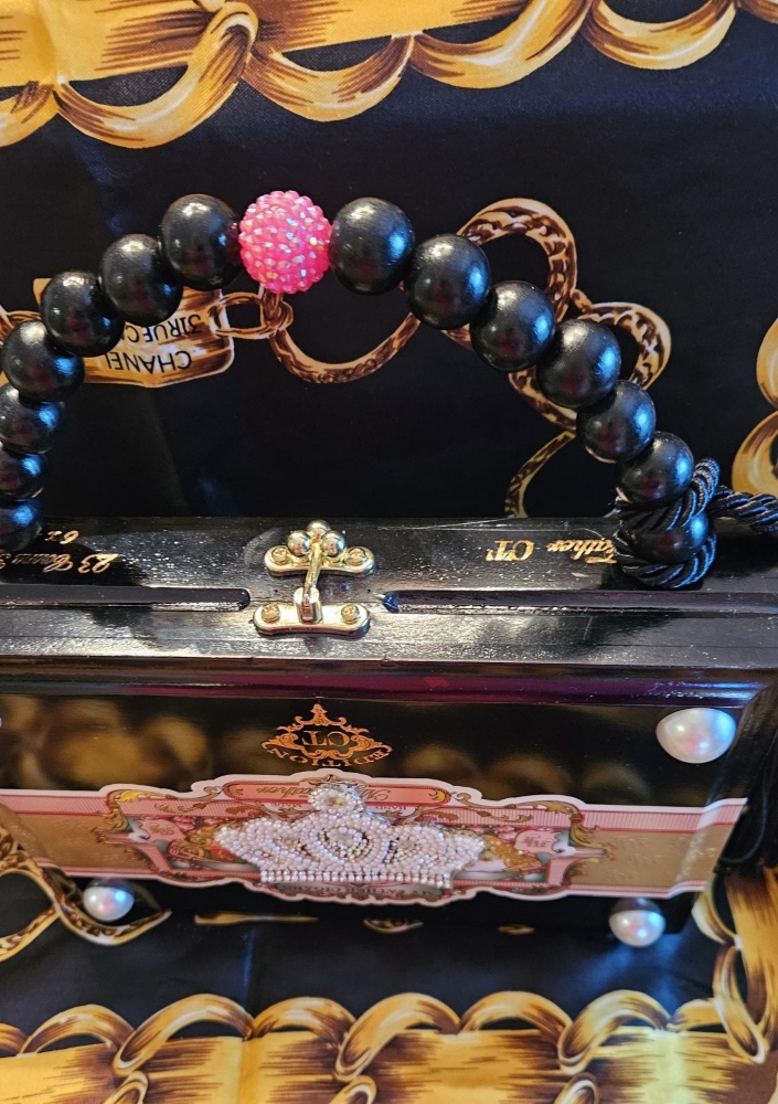This is what I know; I’m just not going to be able to procure these gorgeous My Father cigar boxes forever and every time I find one, I feel like I’ve hit the jackpot! This black, wooden, upcycled cigar box purse is no exception- perfect for any queen or princess! The beautiful pink, gold and aqua labels wrap to the back of the cigar box and grace the inner lid- just so pretty. To embellish further, I added a pearl crown applique to the front of the purse and added four half pearls in the corners. I left the back of the purse authentically as is. The inside has been lined with padded and plush black velvet and black petal trim. I used all black wooden beads and a pink crystal bead in the center along with a substantial black silk tassel to make the handle.