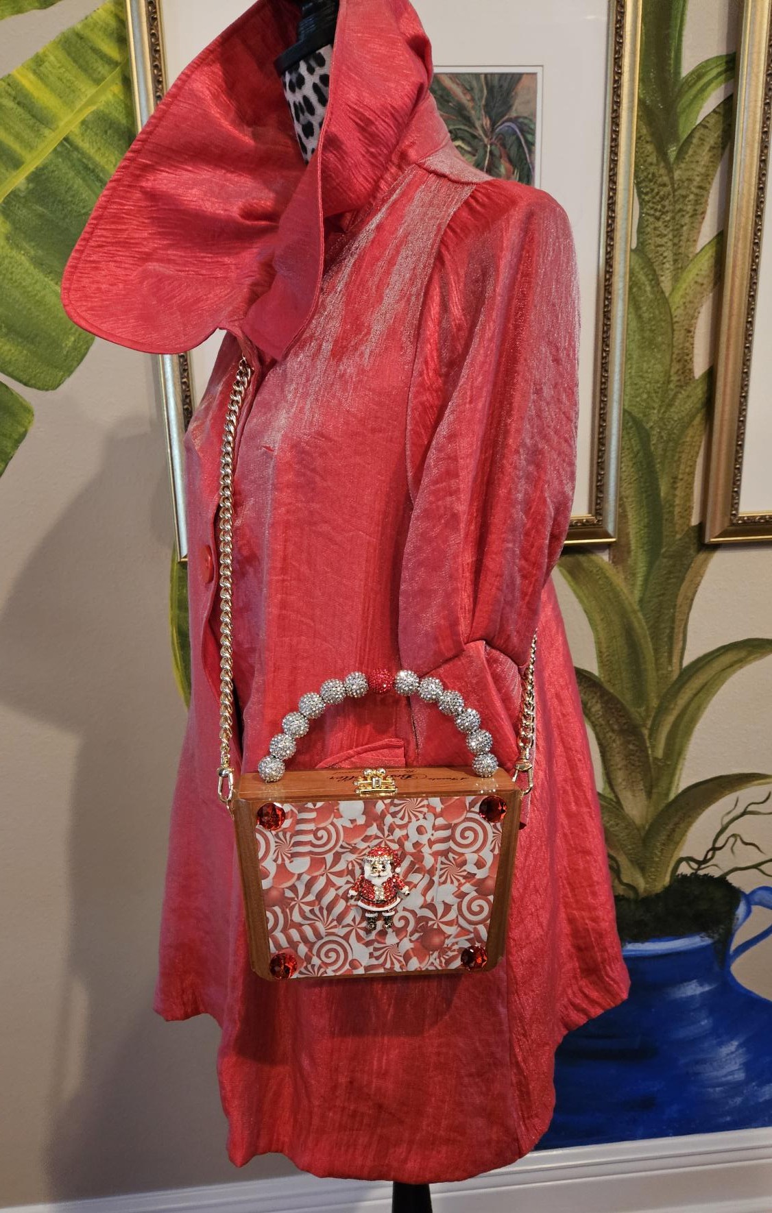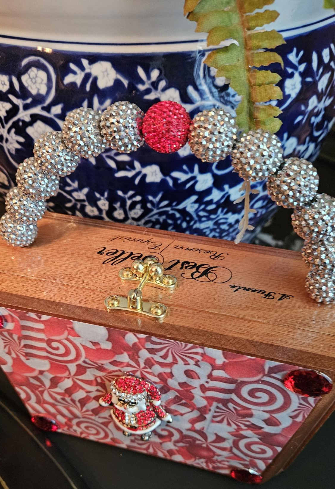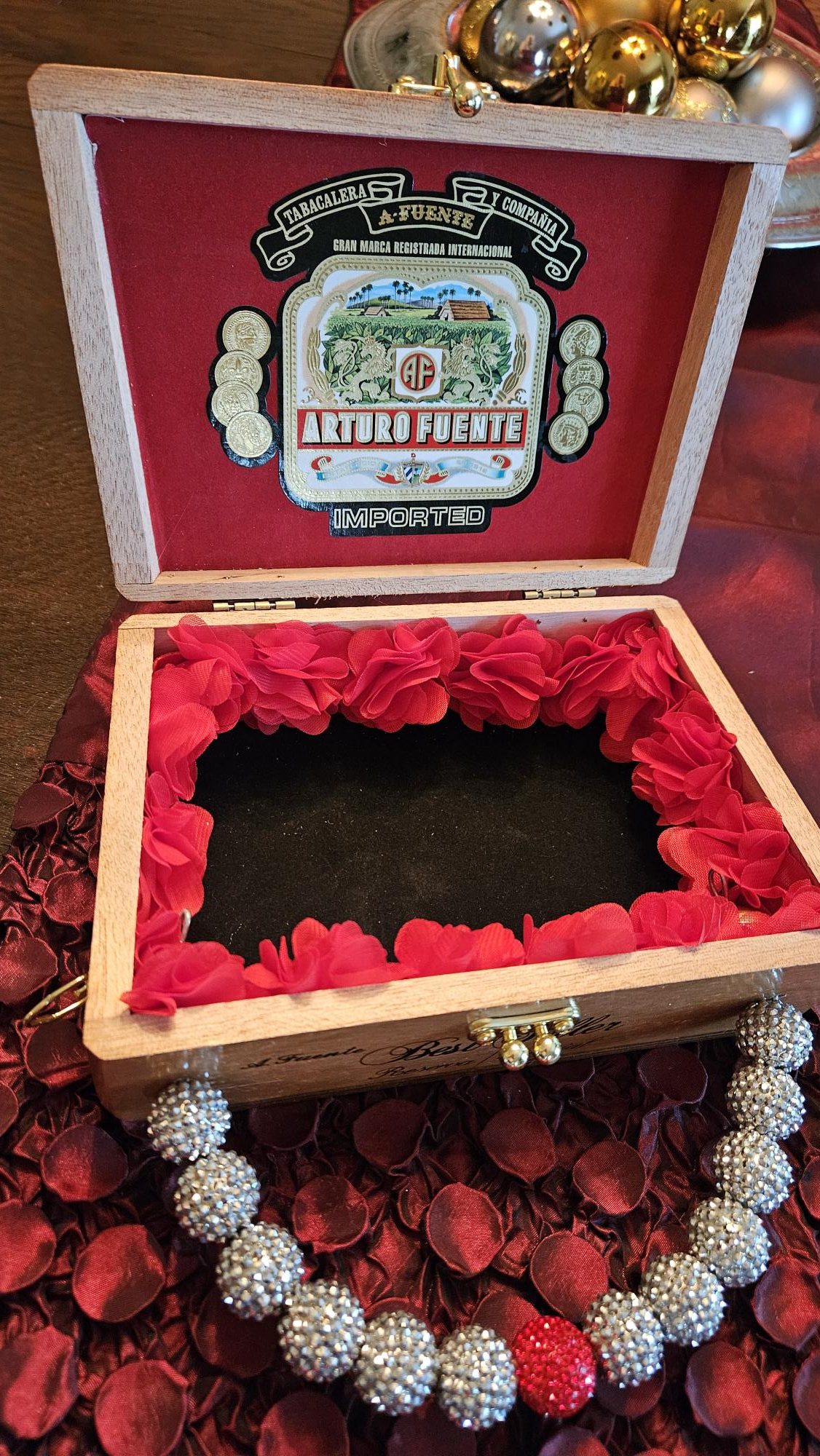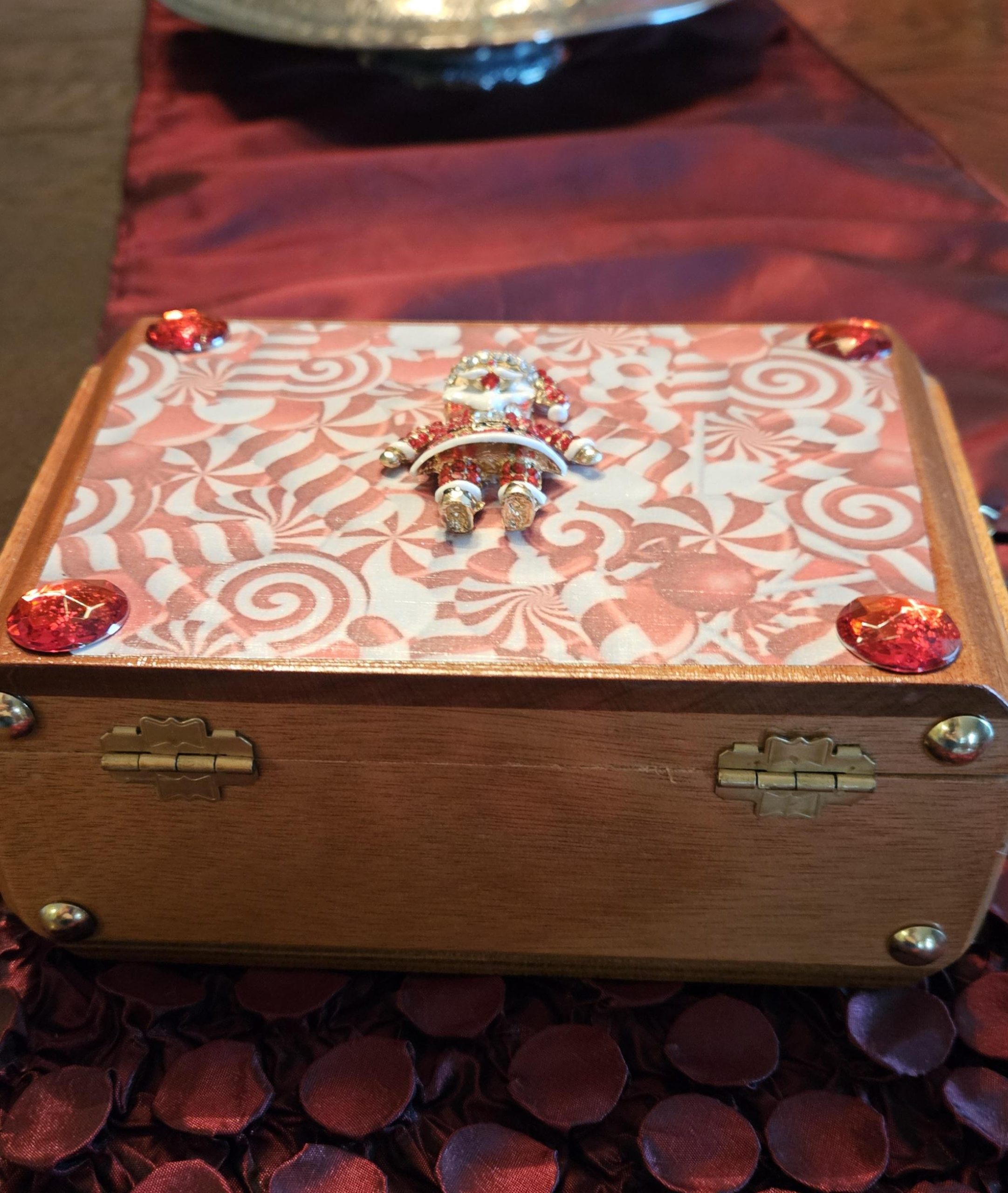 Where to start? I took an Arturo Fuente, Best Seller, wooden, cigar box and decoupaged the darling candy cane image to the front, and then I added the oh so cute repurposed Santa brooch front and center! Four red crystals frame the candy cane image. These boxes really lend themselves to what I do because they are shaped like little purses! The back of the upcycled purse has been painted black and sealed. The interior boasts the original and authentic red velvet Fuente label and original black velvet bottom. I added the red petal trim. The handle is done in silver and red crystal beads. 8 (top) 7.25 (bottom) x 5.5 x 3″