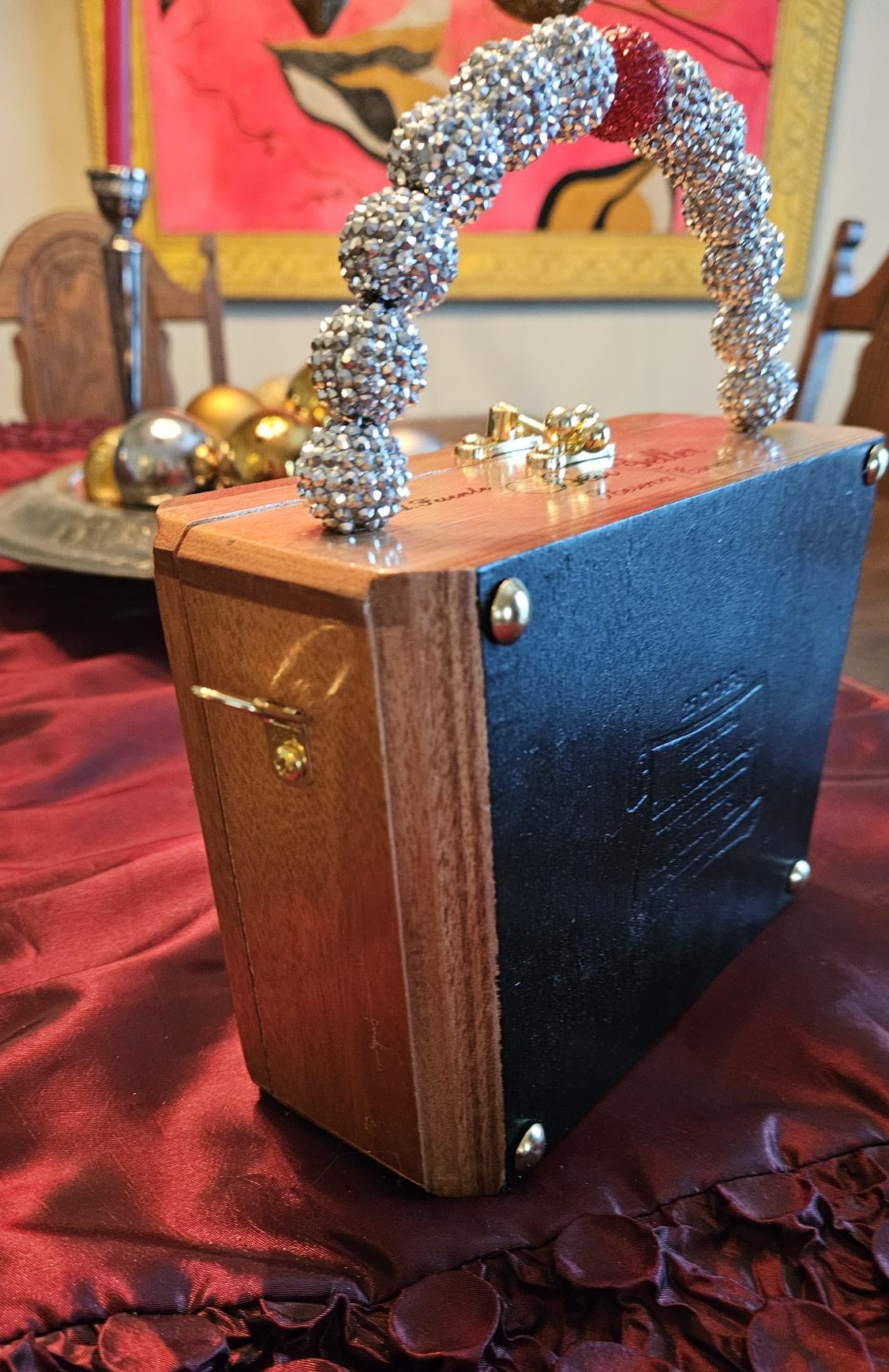 The Fuente cigar box has been flipped so that the opening is now on the top and a gold ball lock added for protection. The back has been painted black, sealed, and gold purse feet have been added to the back and bottom of the cigar box bag for protection. Gold hardware has been attached to the sides so that you may add a strap that you already own. This makes these little cigar box purses of mine versatile in that they can be worn by the handle, over the shoulder or crossbody. I sell gold and silver cross body chains too. The chain on my mannequin, Suzy, is available, but not included.