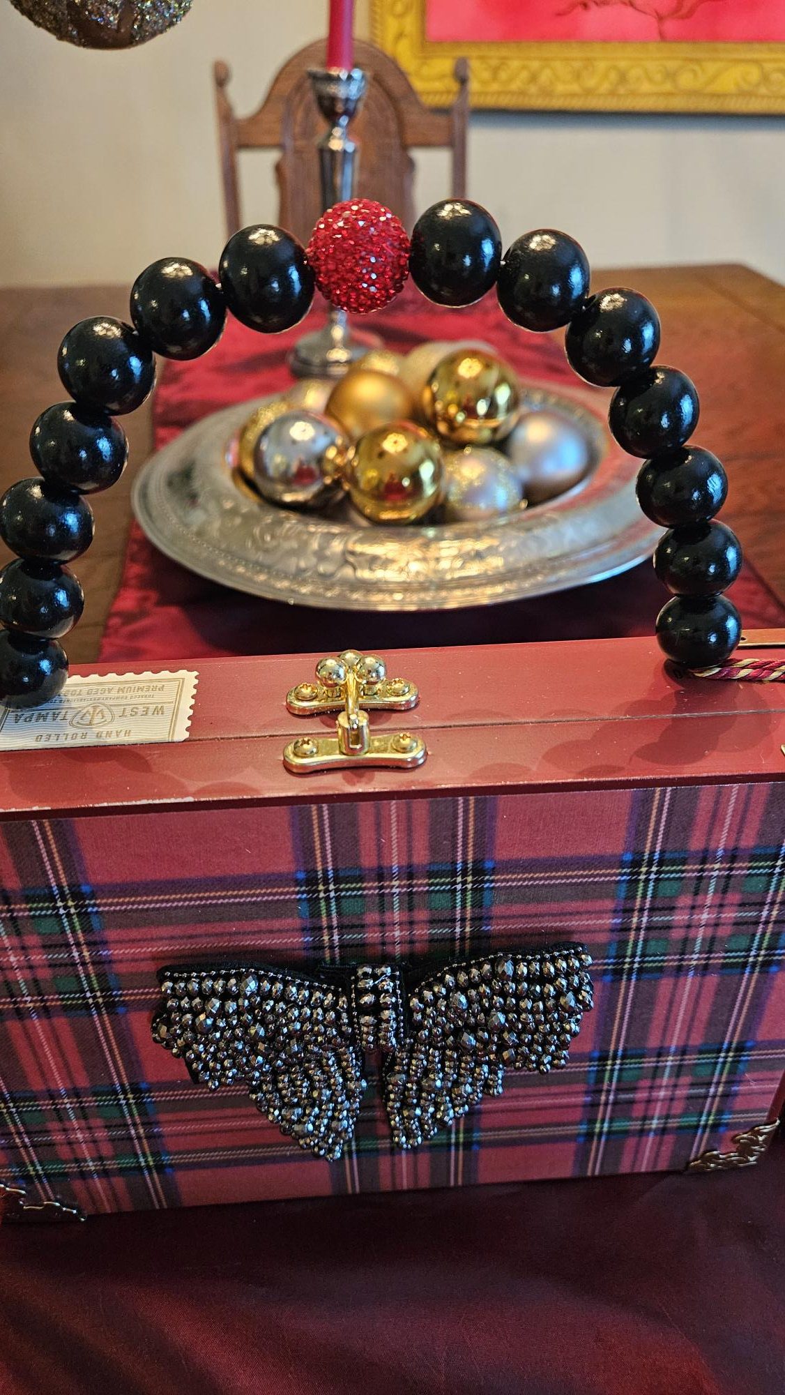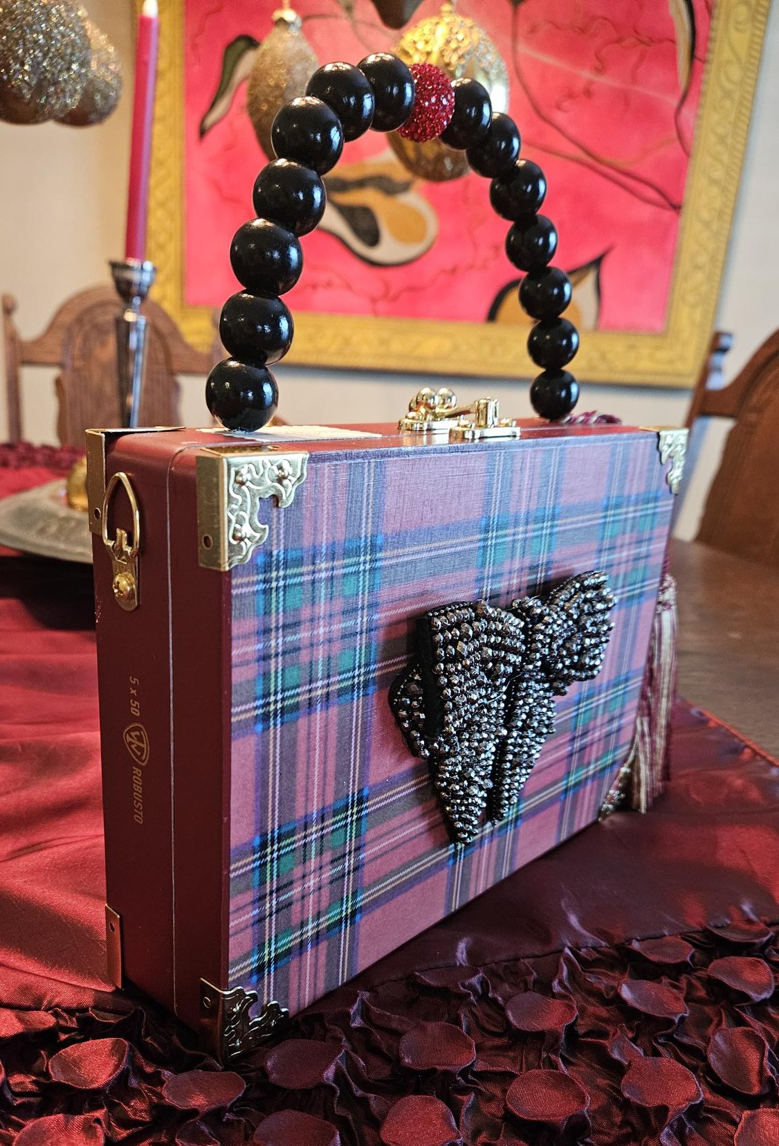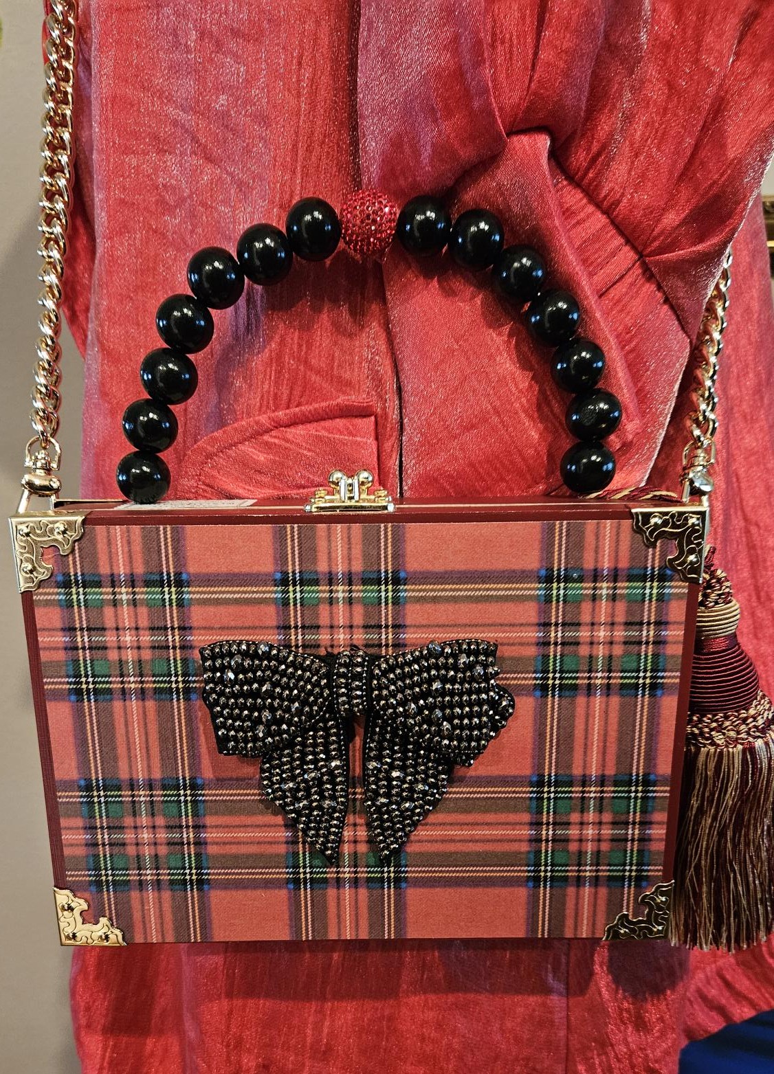2231 Christmas Black Crystal Bow on Red Tartan Plaid Cigar Box Purse