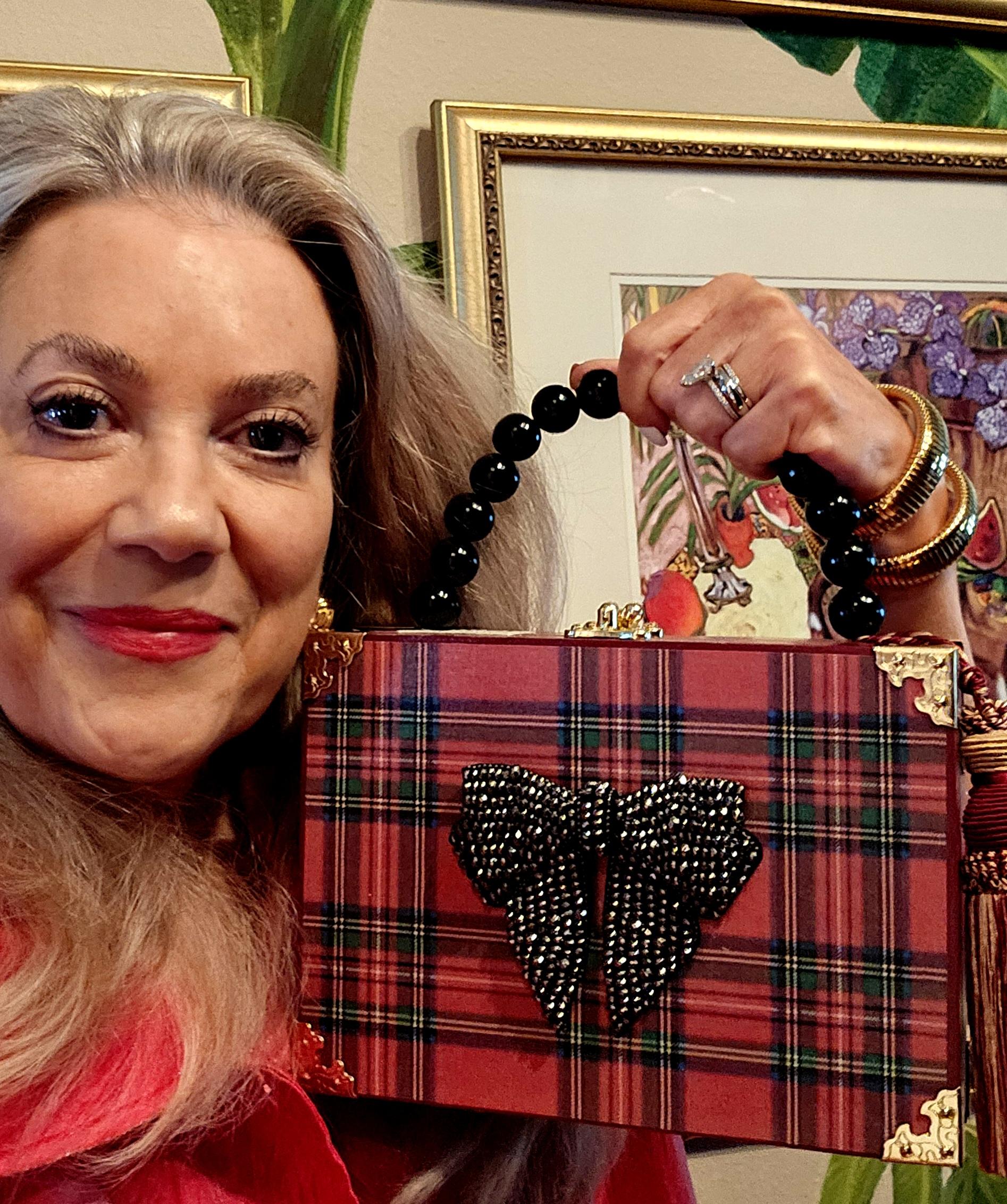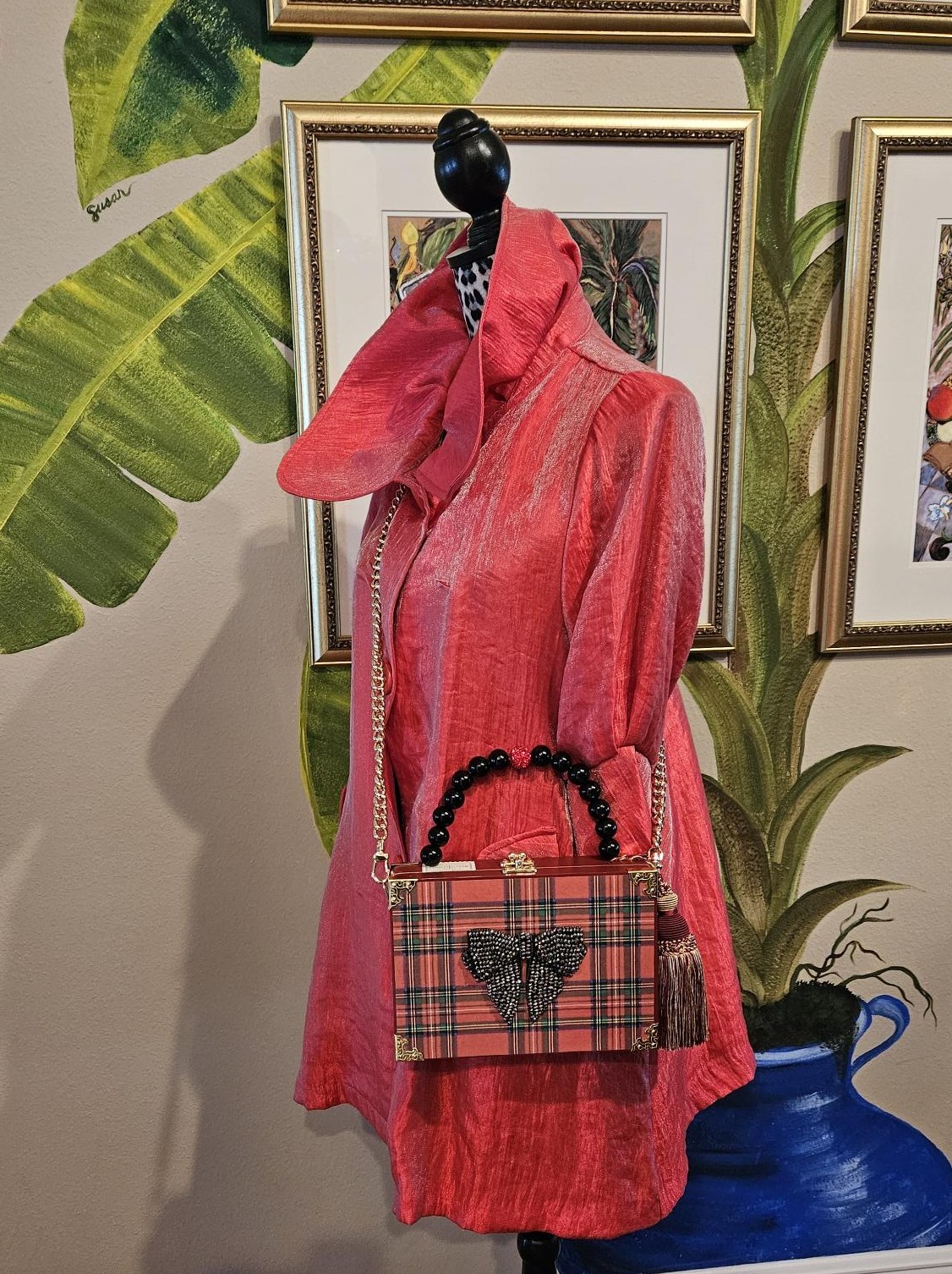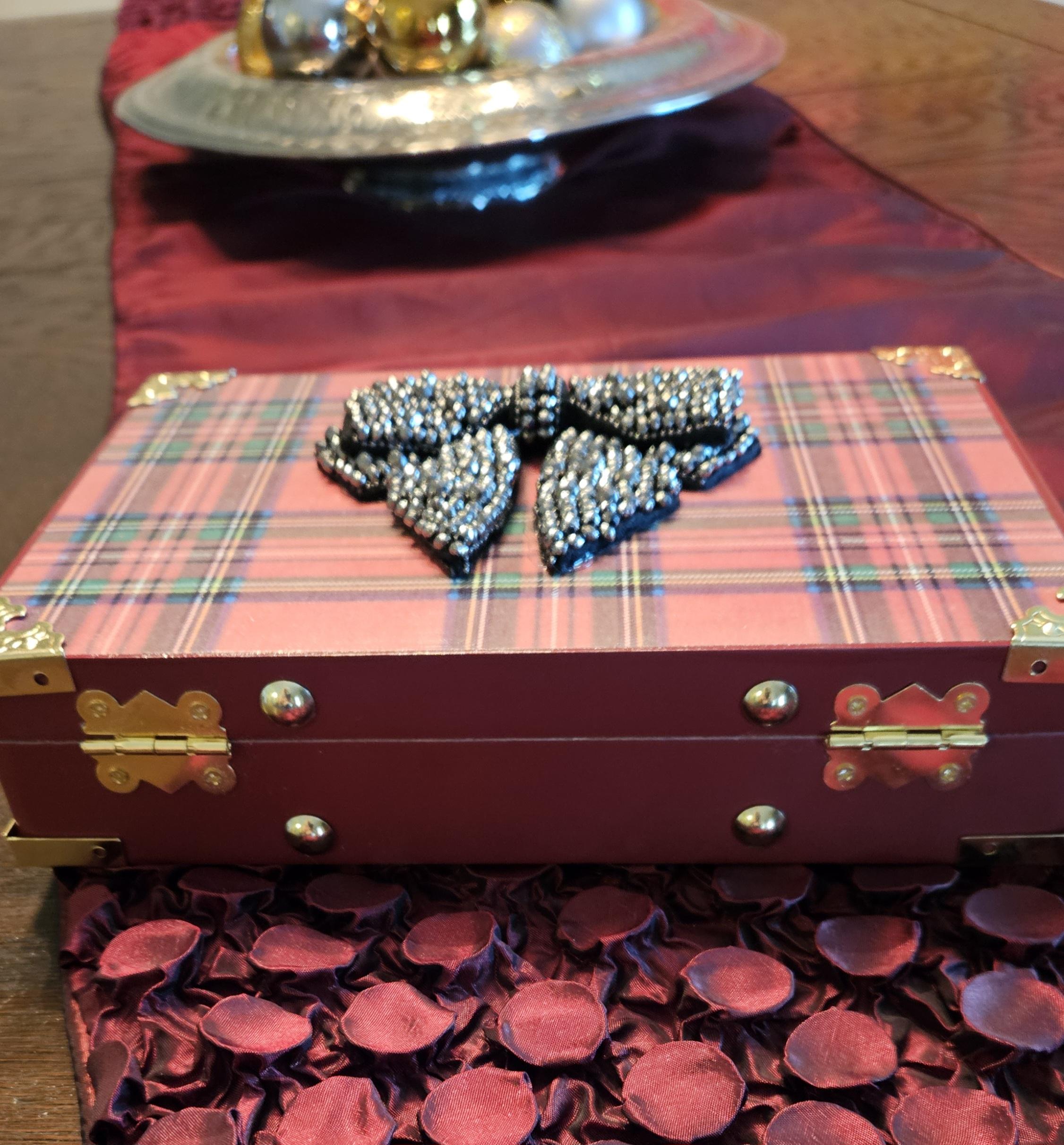 2231 Christmas Black Crystal Bow on Red Tartan Plaid Cigar Box Purse