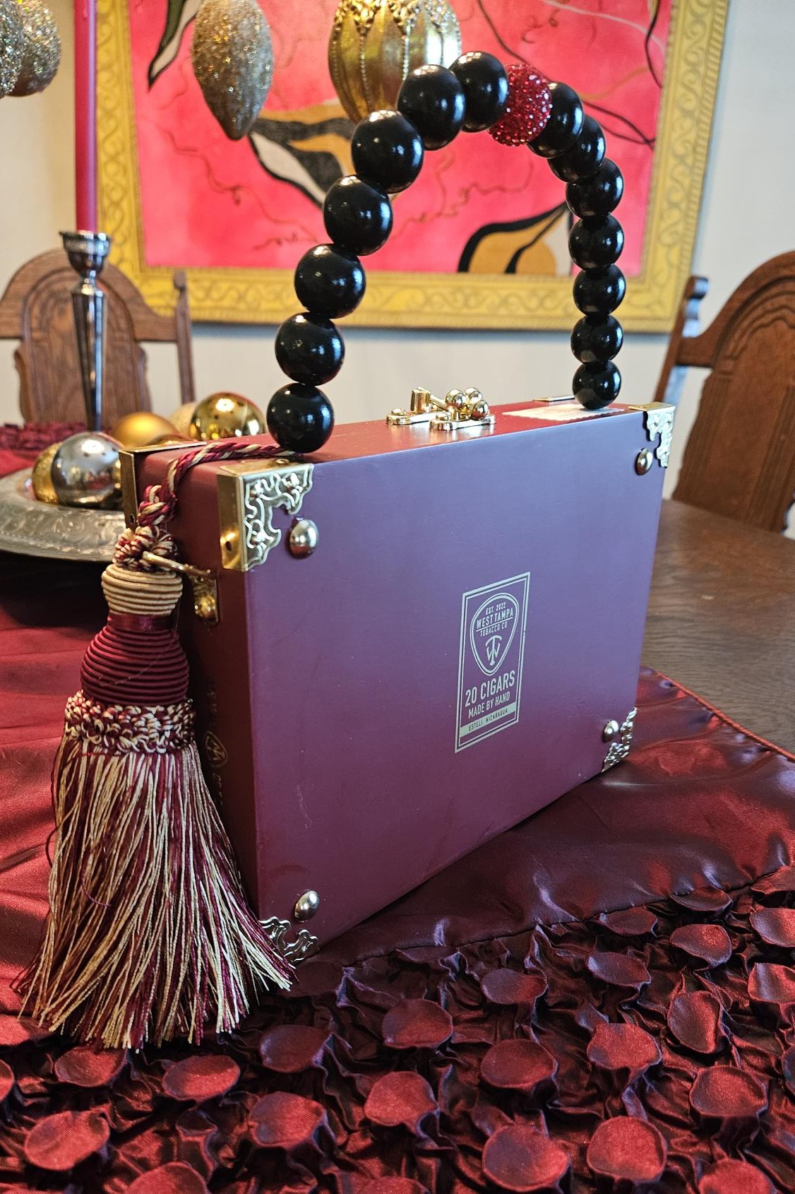 This adorable Humadorable, upcycled cigar box purse is the perfect accessory for all of your dressy holiday parties and looks just as perfect with a black turtleneck and jeans! The black crystal bow rests atop decoupaged red tartan plaid- so smart and pretty! The cigar box is a red, wooden, West Tampa Tobacco Co. with the original seal and inner lid label still in tact. The handle is done in all black wooden beads with a red crystal bead in the center and and a red and gold tassel silk tassel. I lined the interior with padded and plush red velvet and red petal trim. The back has been left in it’s original state.