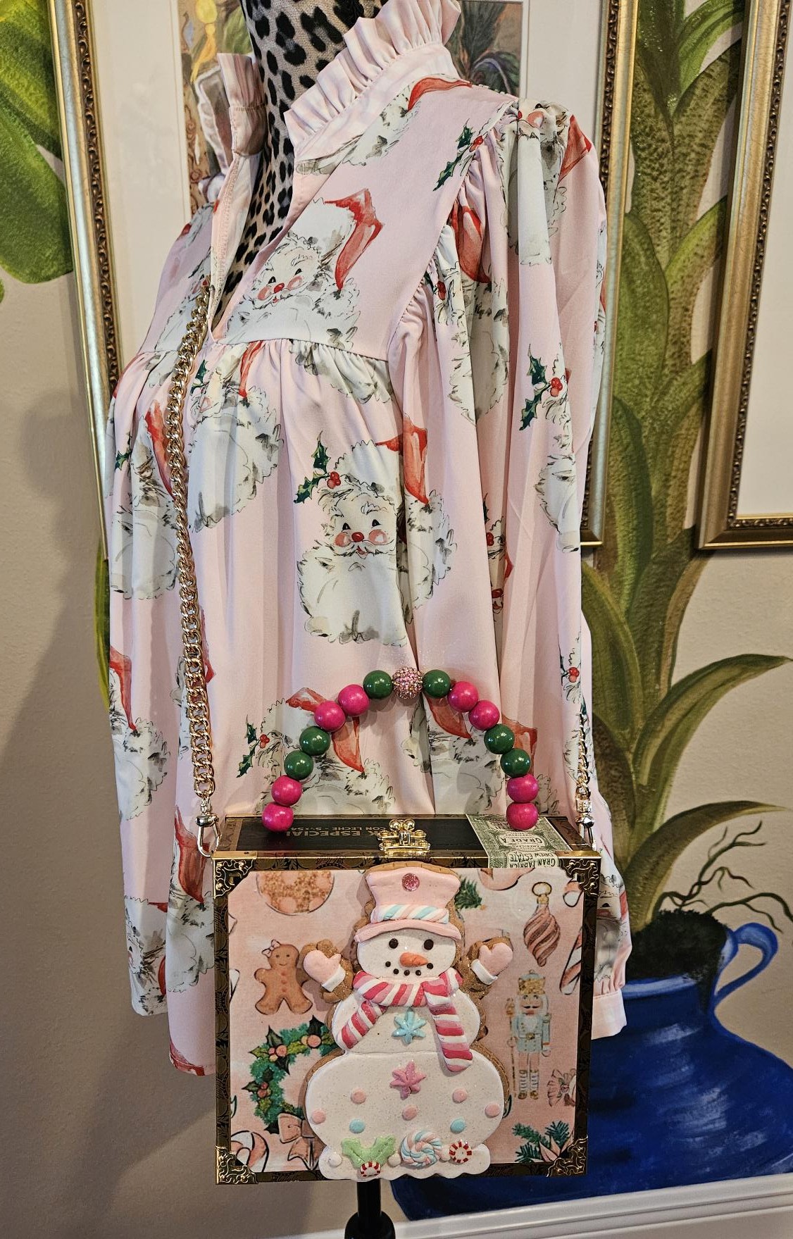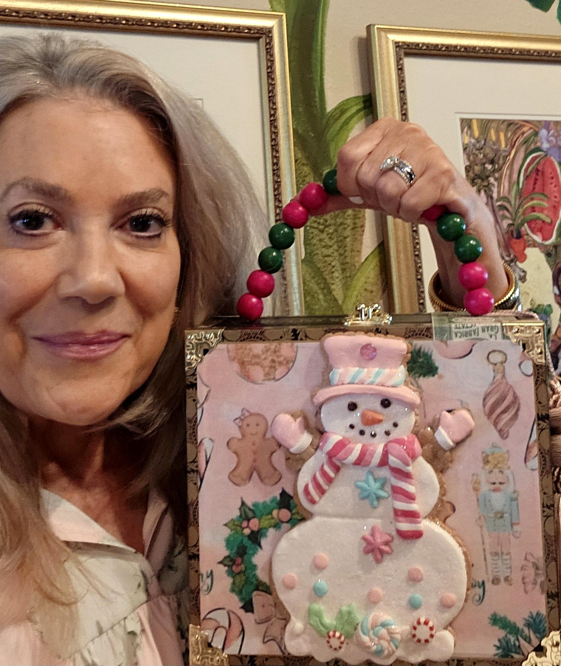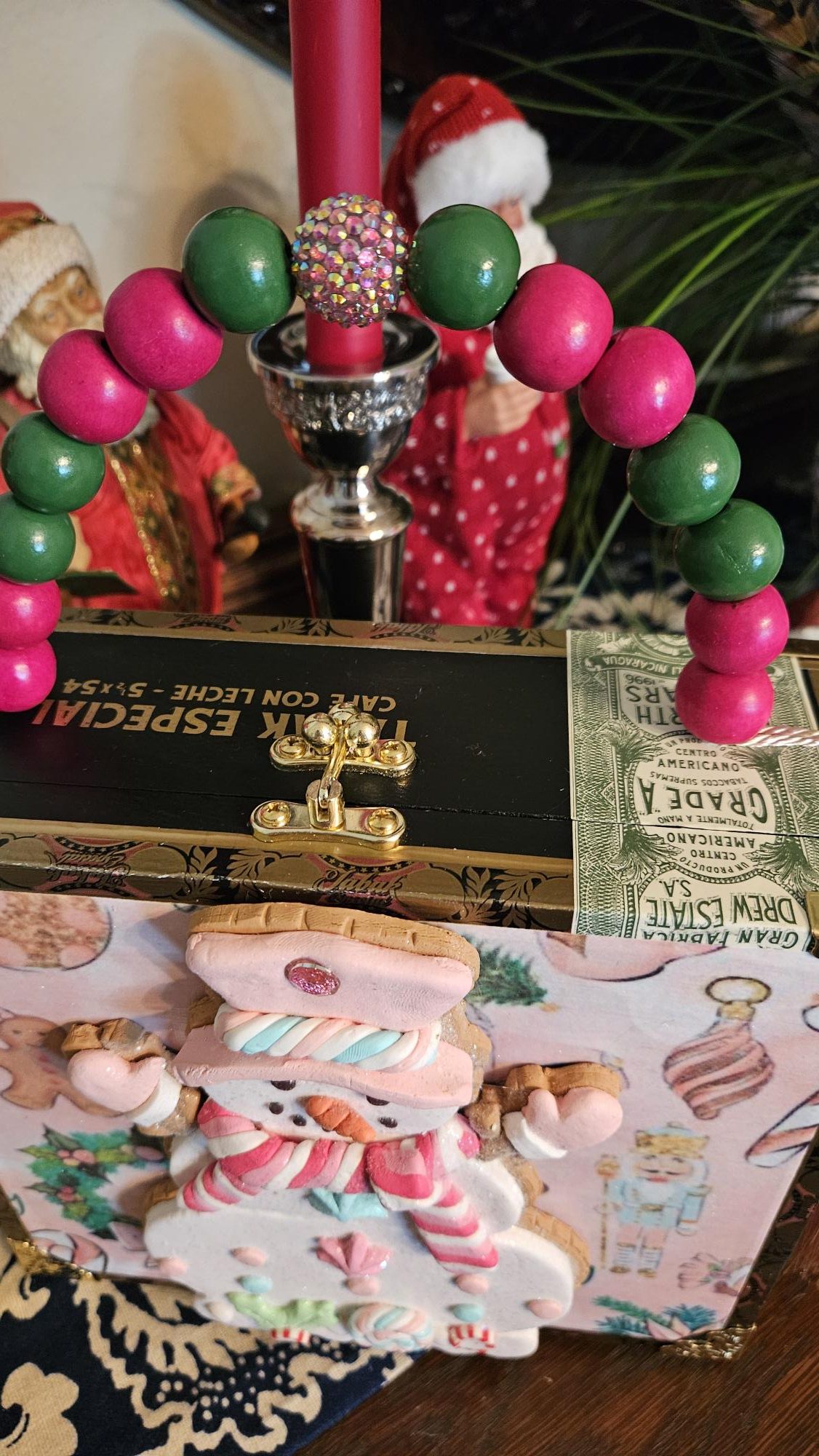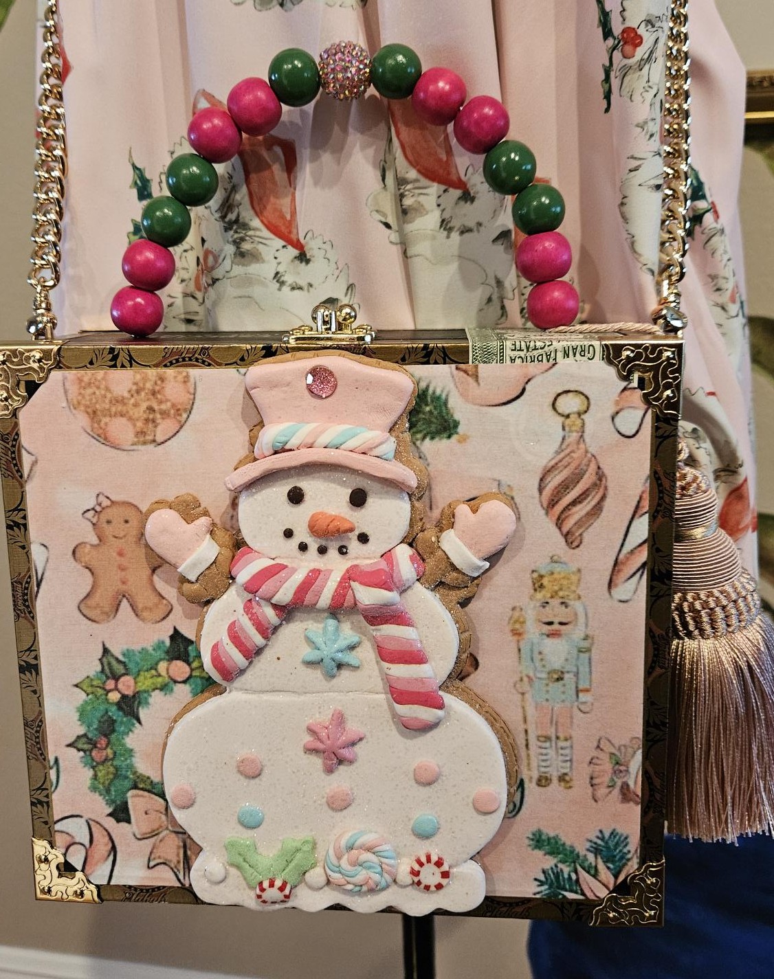 My new favorite! This darling, repurposed, gingerbread snowman ornament made of hard plastic has been securely added to the front of this adorable Humadorable cigar box purse. The decoupaged pink back ground is Christmas themed. The cigar box is a black, wooden Tabak and the back has bee left in its original state. The handle is done in pink and green beads with a pink silk tassel. I lined the interior with padded and plush pink velvet and green ball trim. Be ready for compliments! You’ll wear this one every Christmas from now to eternity. 8 x 8.75 x 3.5″