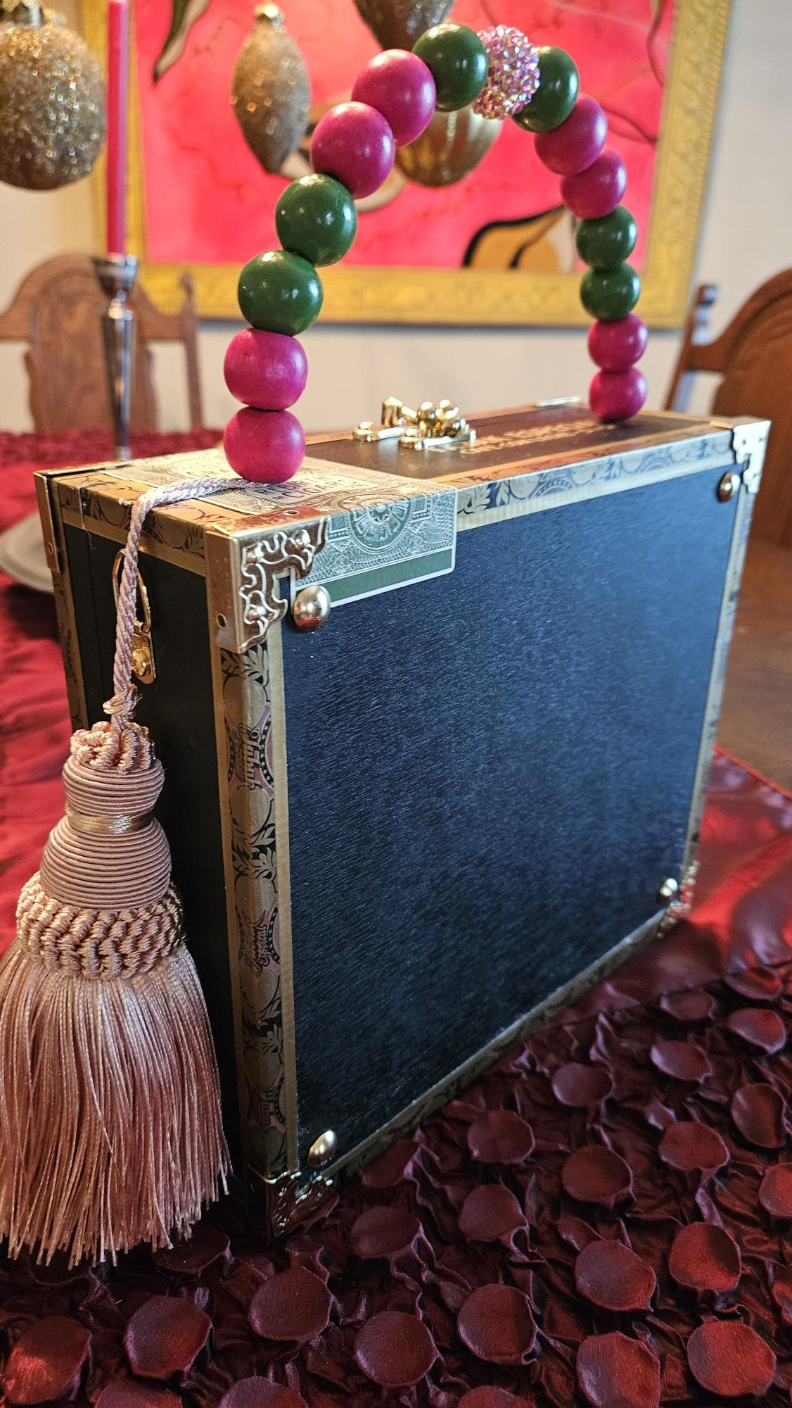 The cigar box purse has been flipped so that the opening is now on the top and has been given a gold three ball lock for security. Eight gold purse feet have been added to the back and bottom  for protection. Gold hardware has been attached to the sides so that you may add a strap that you already own. This makes these little cigar box purses of mine versatile in that they can be worn by the handle, over the shoulder or crossbody. I sell straps and gold and silver crossbody chains too. The chain on my mannequin, Suzy, is available, but not included.