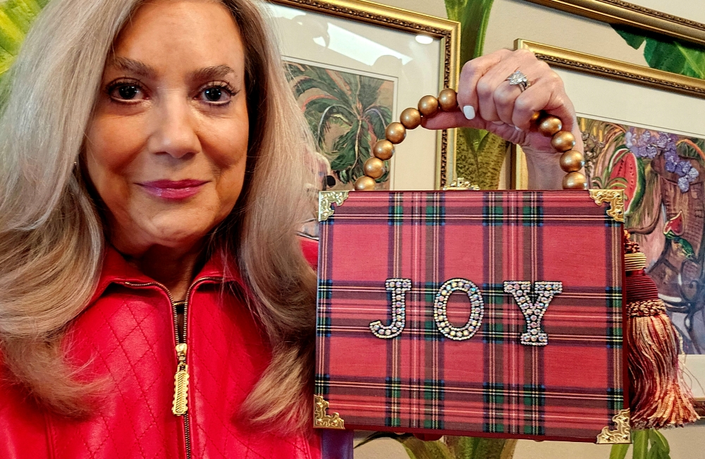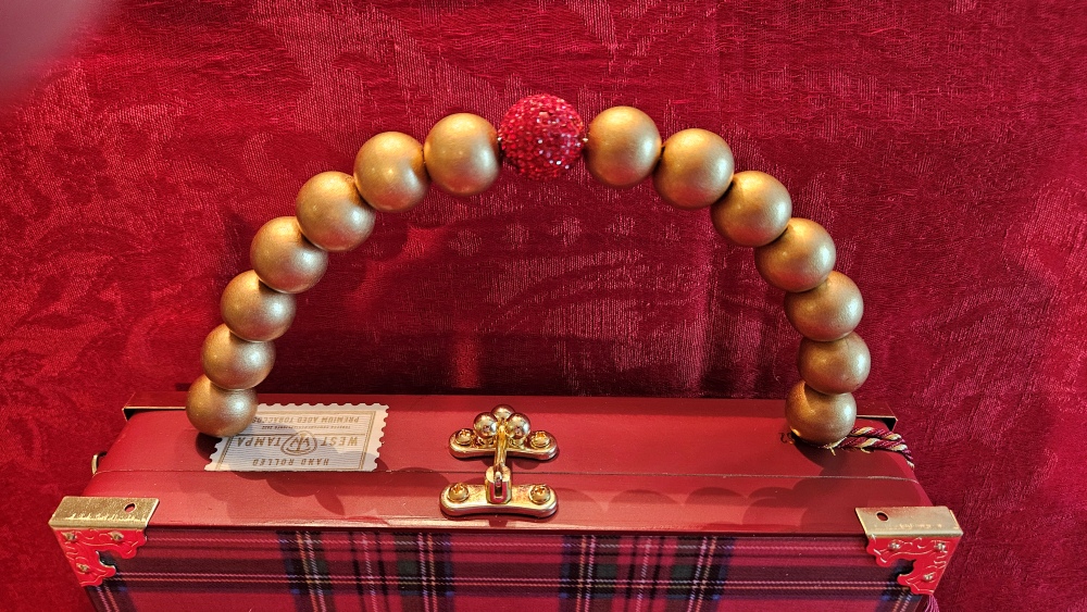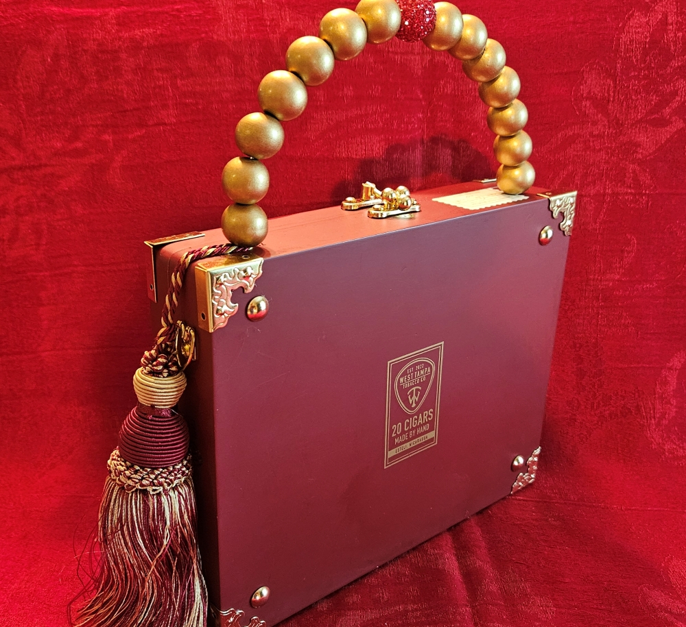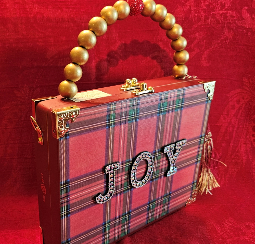 My adorable Humadorable Christmas handbags will bring a smile to you and the people you meet every Christmas season from now to forever and then can be passed down! This red, wooden, repurposed, West Tampa Tobacco Co. cigar box has the original label on the inner lid and the back has been left in it’s authentic and original state. The partial cream seal remains in tact. I decoupaged the front of the purse in a classic red tartan plaid and added the sparkly letters that spell “JOY”. The handle is done in gold wooden beads with a red crystal bead in the center and a crimson and gold silk tassel. The inside has been beautifully lined with padded and plush red velvet and red petal trim. A JOY to carry!