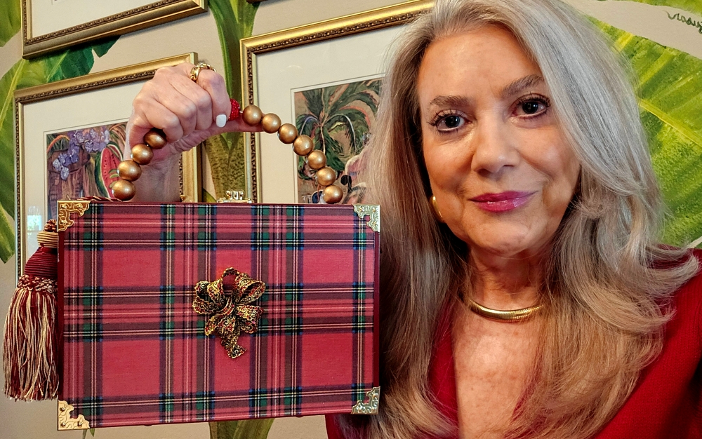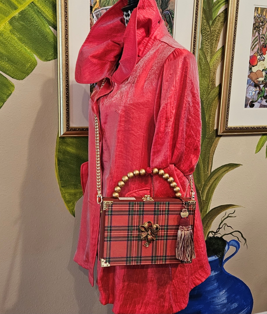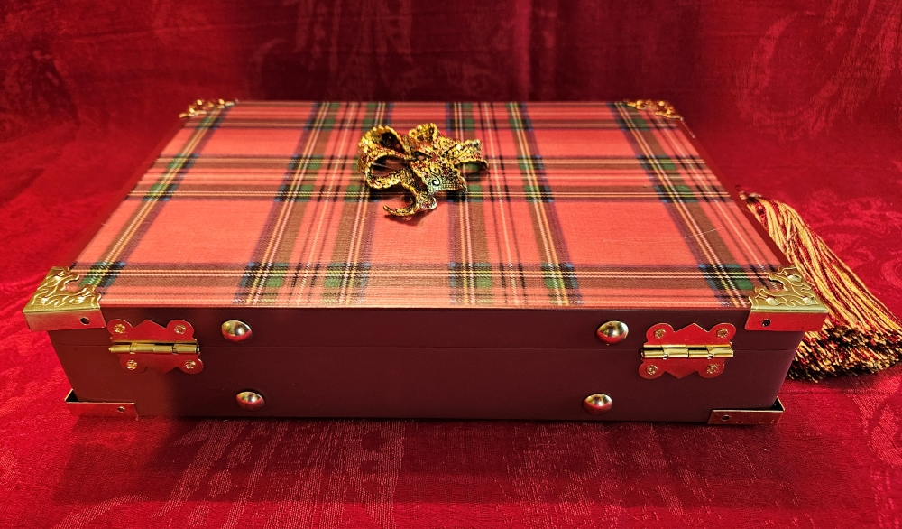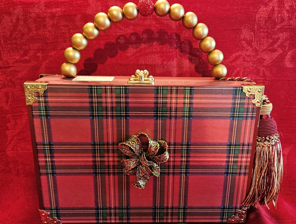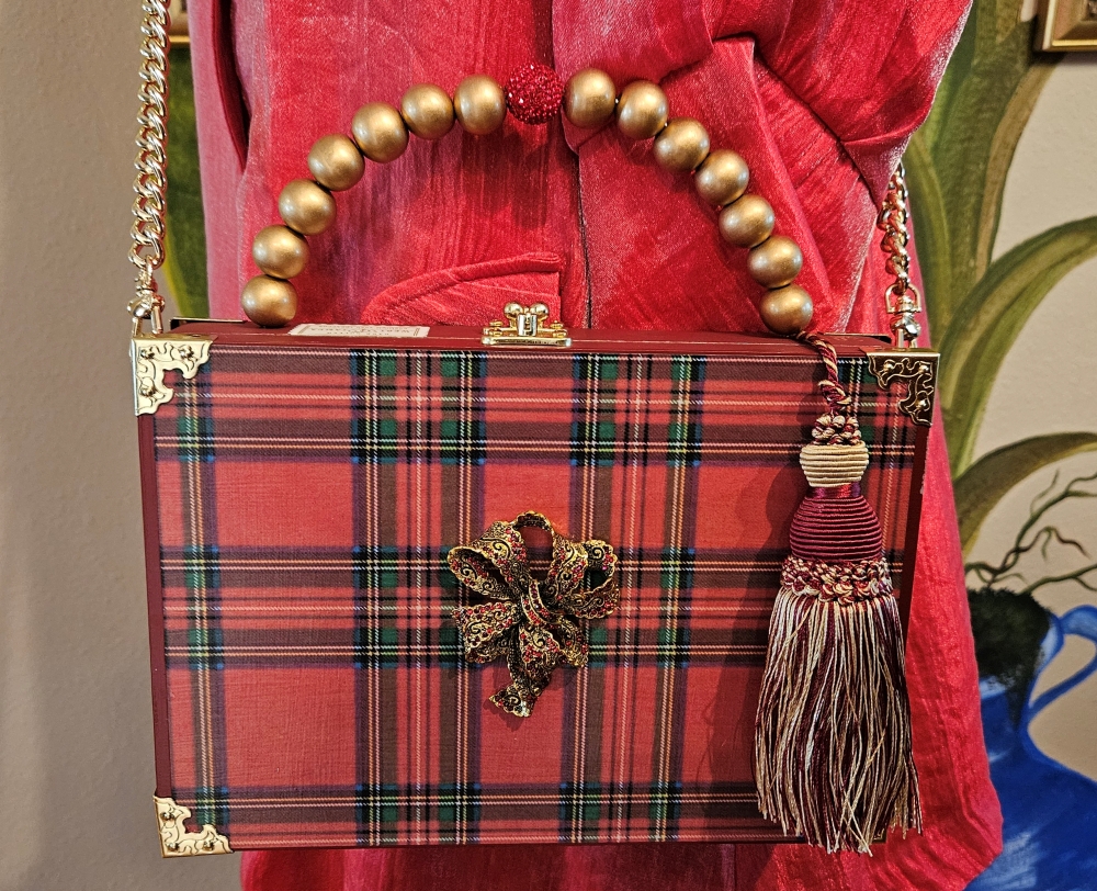 2211 Christmas Red Crystal Bow on Tartan Plaid Cigar Box Purse
