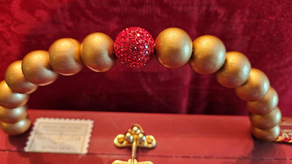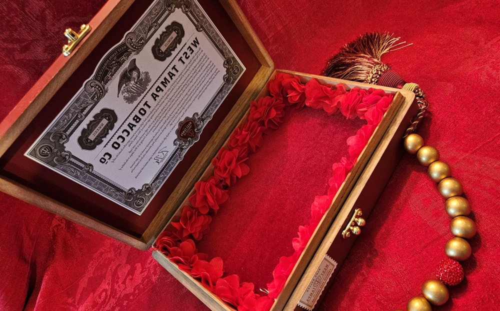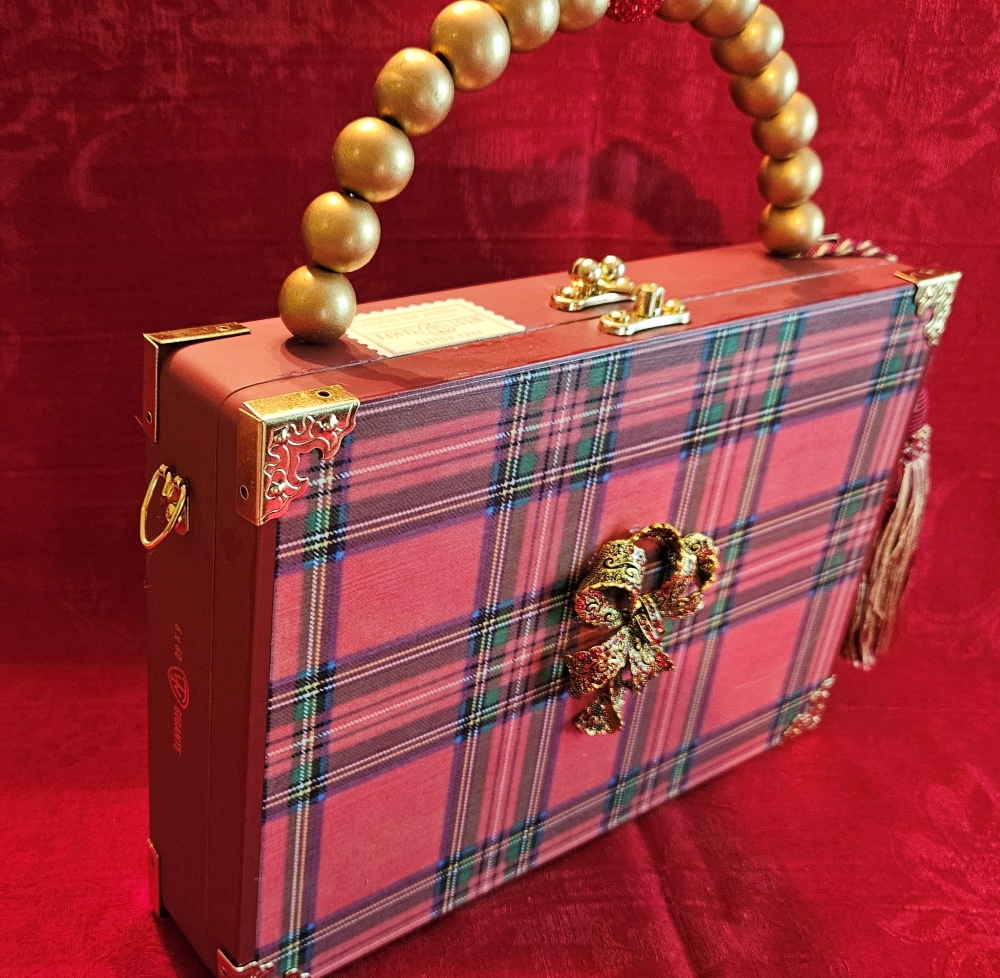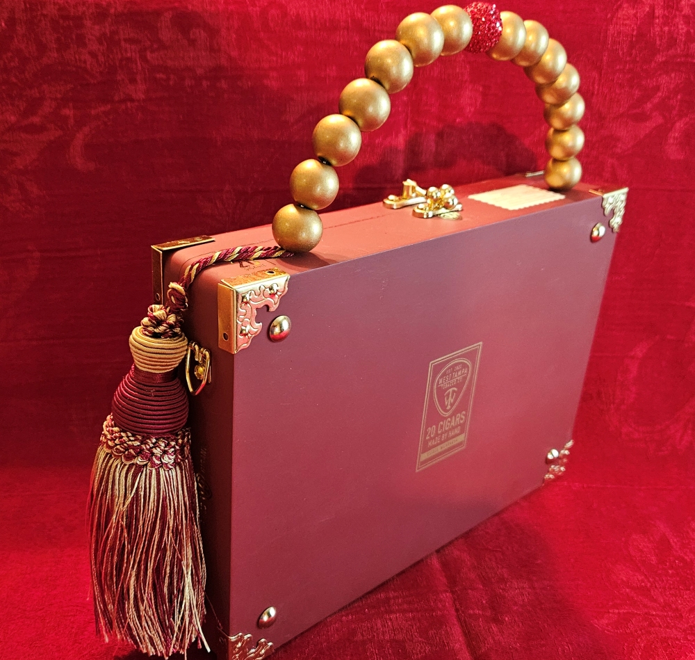 This repurposed cigar box handbag starts with a gorgeous, red, West Tampa Tobacco Co. cigar box. I decoupaged a red tartan plaid image to the front and added the upcycled and stunning gold and red crystal brooch front and center. The original logo graces the inner lid and I lined it with padded and plush red velvet and red petal trim. The handle has been done in gold wooden beads with a red crystal center bead and a red and gold tassel. The back has been left authentically as is.