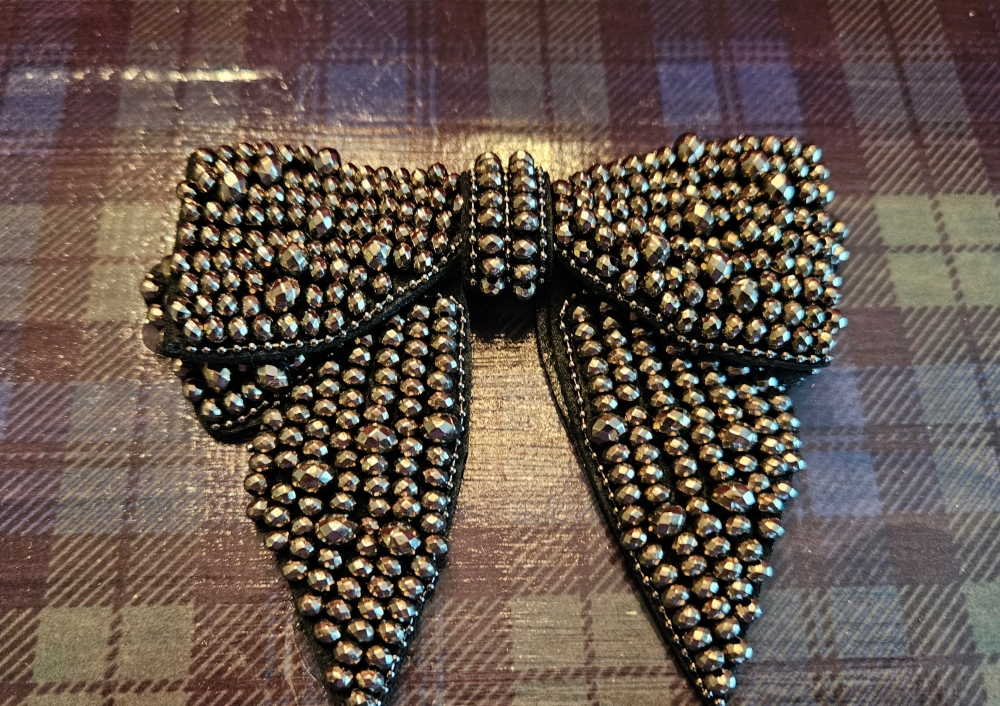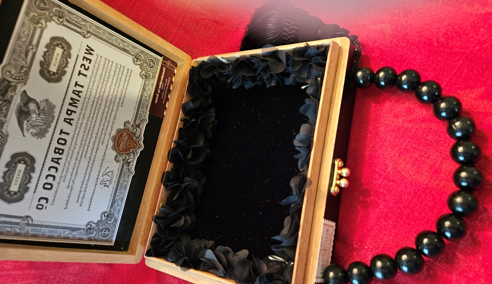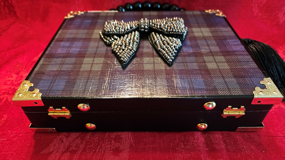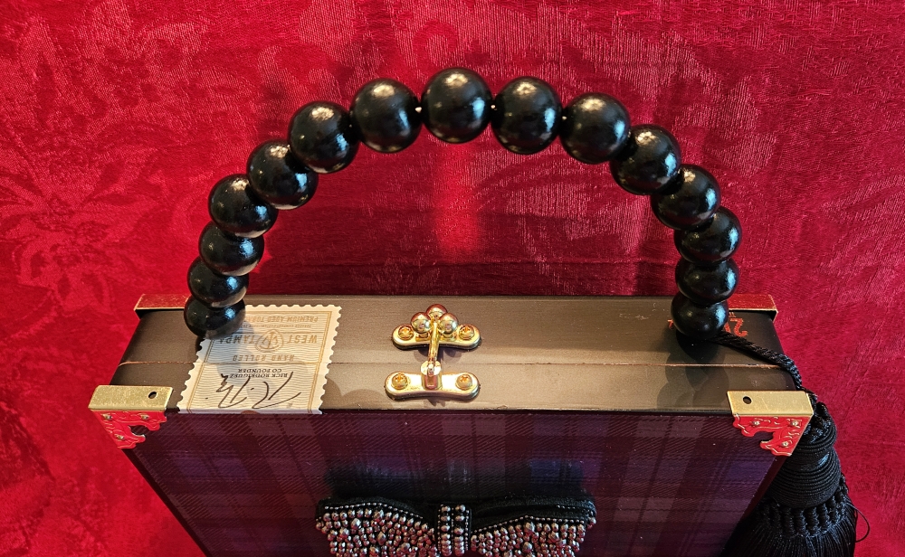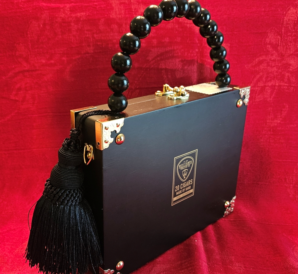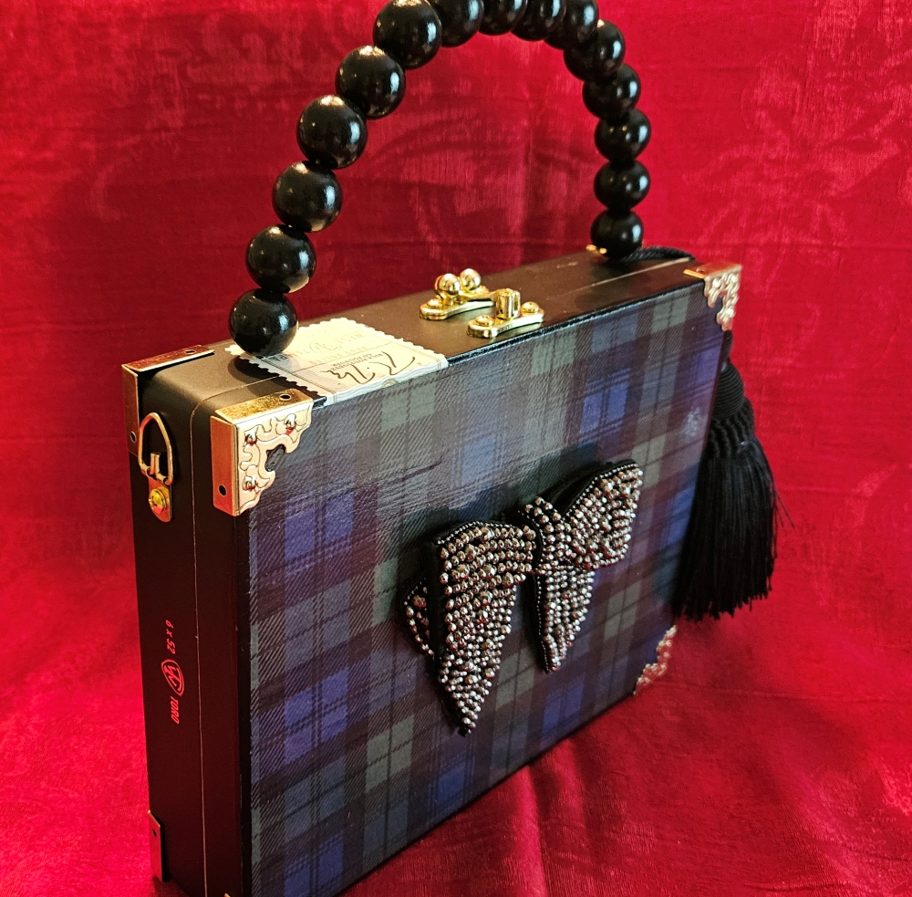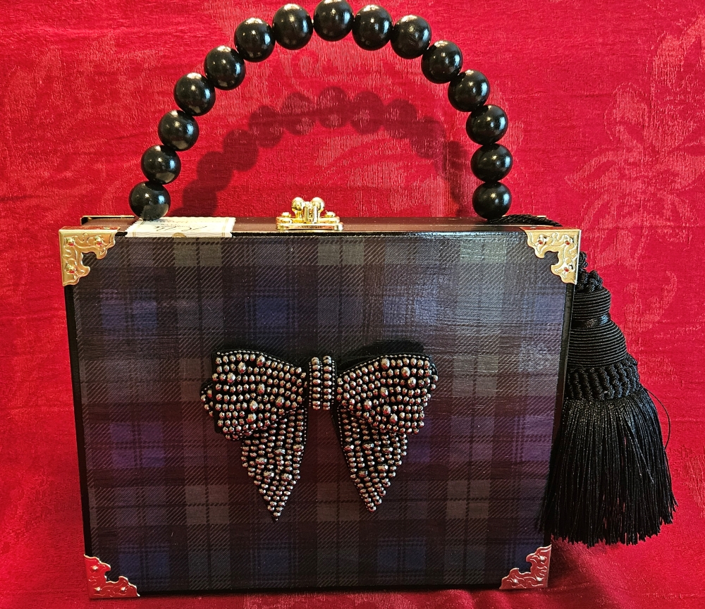 This adorable Humadorable, upcycled cigar box purse is the perfect accessory for all of your dressy holiday parties and looks just as perfect with a black turtleneck and jeans! The black crystal bow rests atop decoupaged watch plaid- so smart and pretty! The cigar box is a black, wooden, West Tampa Tobacco Co. with the original seal and inner lid label still in tact. The handle is done in all black beads and a substantial black silk tassel. I lined the interior with padded and plush black velvet and black petal trim. The back has been left in it’s original state.