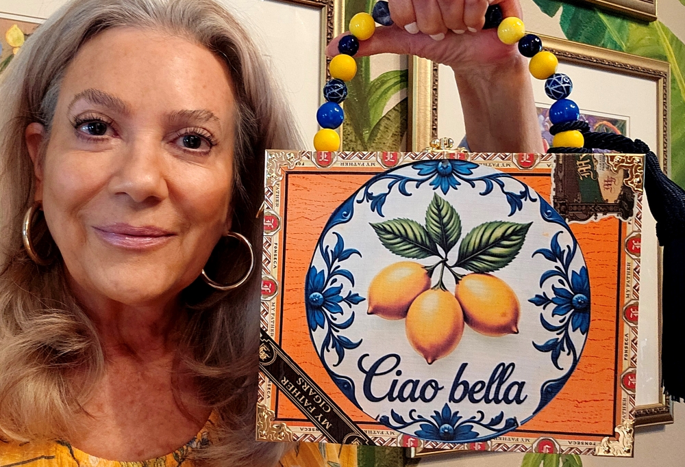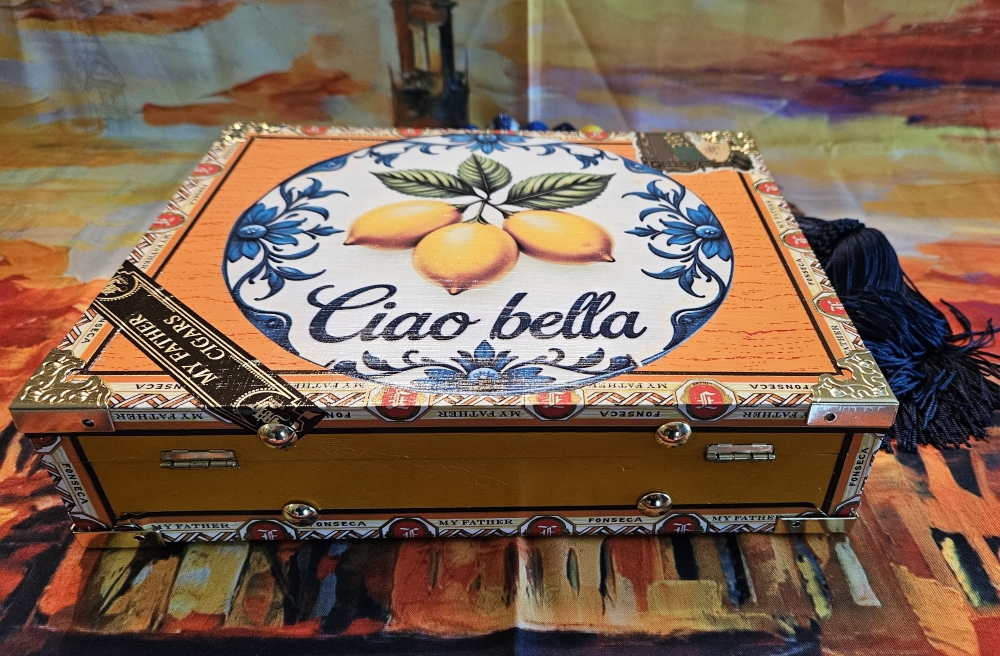 This gorgeous Sorrento lemon image has been lovingly decoupaged onto the front of a pretty, yellow, wooden, My Father, Foseco cigar box. The back of the repurposed box has been painted black and sealed. The ornate green seal remains authentically in tact as well as the original and authentic label on the inner lid. The interior is line with padded and plush blue velvet and blue petal trim. I did the handle in blue and yellow beads with a substantial blue silk tassel- so pretty and fresh! 7.5 x 9.25 x 2.25″