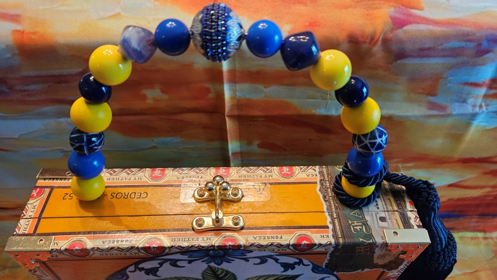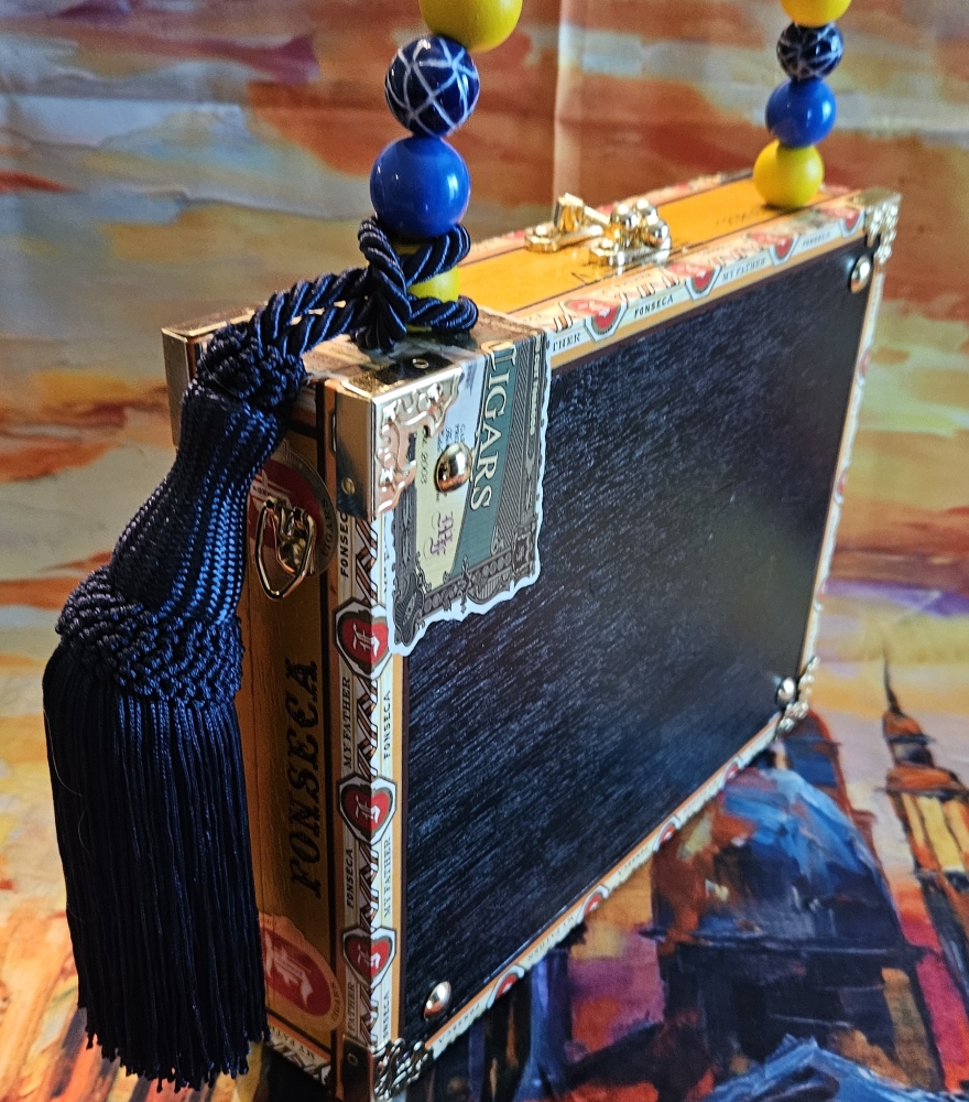 THIS IS AN AUTHENTIC CIGAR BOX PURSE, SO SMALL FLAWS INFLICTED BY THE SMOKERS OF THE CIGARS ARE TO BE EXPECTED! Also, these are all hand made by me, not a machine, so when applicable, fluctuations in my decoupage medium can also occur.  They only add character and charm! Large flaws will be noted in the description. If you don’t like what you see, I can do custom cigar box purses and can include anything you like!- pictures of family members, pets, places- you name it! I always ship insured.  Feel free to call or text me with questions. 813-416-7071  Please sign up for email via this site to get in on sales and new products. Also please follow Humadorables by Susan on Instagram.