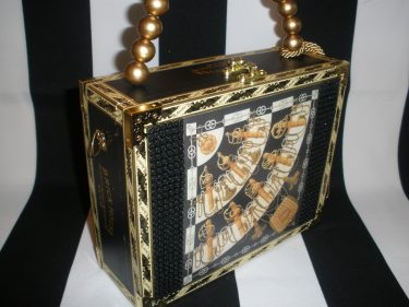 I can’t get enough of these gorgeous vintage scarves and really love to adorn my cigar box creations with them. This black and gold, equestrian scarf image has been decoupaged onto the front of a black, wooden, Brick House, Mighty Mighty (yes, like the song) cigar box. The lovely scarf, designed for Hermes in 1972 by Julia Abadie, was named Cliquetis, which is the French verb meaning to jingle or clank. Tassels, bits, a fancy saddle bag and various other jinglers and clankers make up the mix. I added six rows of black bling to each side of the image to jazz it up even more! The back of the up cycled cigar box has been left in it’s authentically original state as has the Brick House plantation scene label on the inner lid. I lined the inside of this beauty with padded and plush black velvet and gold trim. The handle is made up of all gold beads and a fat gold tassel. The purse has been flipped so that the opening is now on the top and has been given a gold three ball lock for security. Eight gold purse feet have been added to the back and bottom and eight gold corner protectors to the back and front corners for protection. Gold hardware has been attached to the sides so that you may add a strap that you already own. This makes these little cigar box purses of mine versatile in that they can be worn by the handle, over the shoulder or cross- body. I sell straps and gold and silver cross body chains too. The chain in the last photo is available, but not included. 7.25 x9.25 x 3.5″ ** THIS IS AN AUTHENTIC CIGAR BOX PURSE, SO SMALL FLAWS INFLICTED BY THE SMOKERS OF THE CIGARS ARE TO BE EXPECTED! They only add character and charm! Large flaws will be noted in the description. If you don’t like what you see, I can do custom cigar box purses and can include anything you like!- pictures of family members, pets, places- you name it! I always ship insured. Feel free to call me! 813-416-7071 cell. Please follow Humadorables by Susan on Instagram.