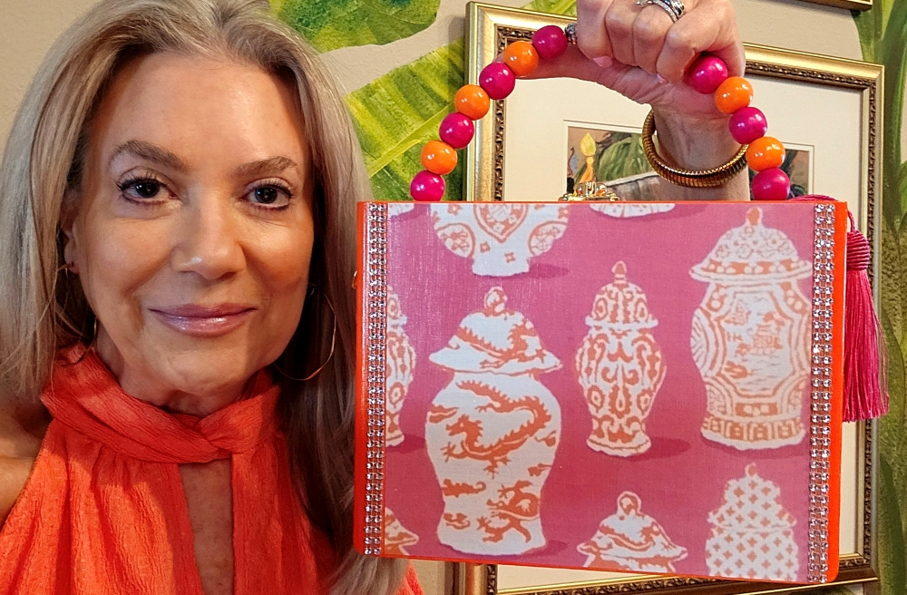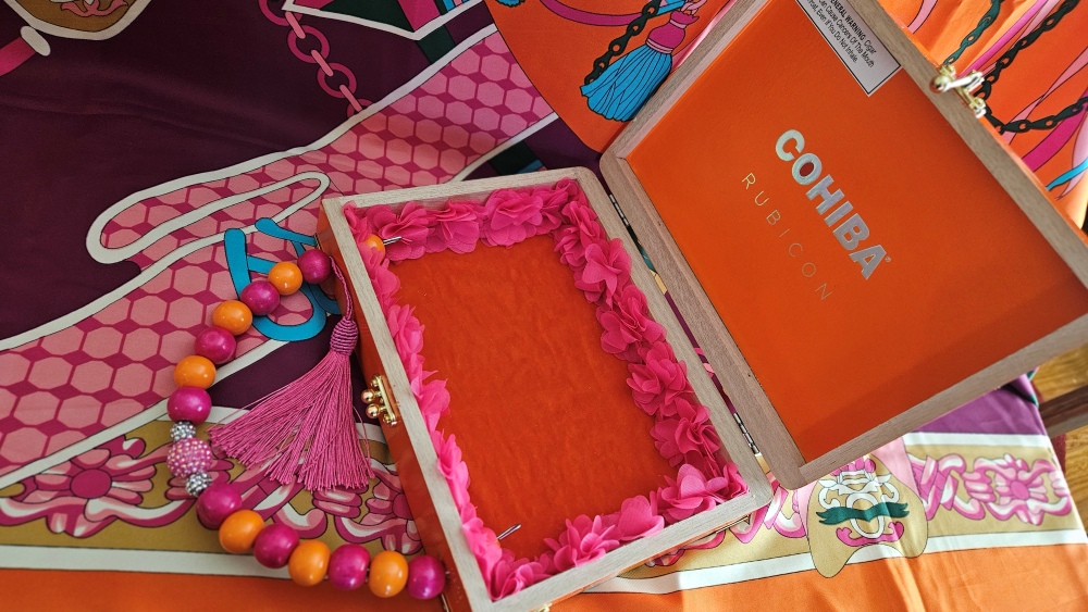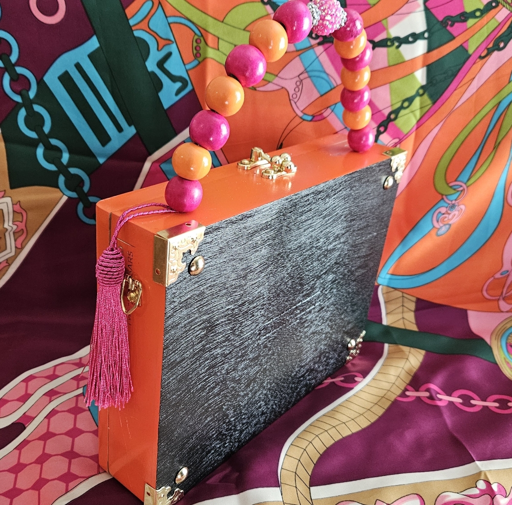 I personally love ginger jars and a touch of chinoiserie whimsy! This adorable Humadorable, has a pretty pink on orange ginger jar decoupaged image and lucky enough to be on an orange Cohiba cigar box! Rows of pink bling adorn the sides. The inside lid of the now cigar box purse has the original Cohiba logo and has been lovingly lined with orange velvet and hot pink petal trim! You will look for an excuse to open it up to show it off! The handle is made up of pink, orange, and crystal beads a nd a pink tassel- so pretty. The back of the cigar box bag has been painted black and sealed. 7.25 x 9.5 x 2.5″