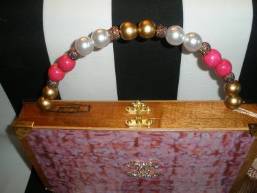 I just love a good pink boucle cigar box purse with a CC brooch… said Susan! I decoupaged this beautiful pink boucle image to the front and back of an up cycled to the nth, Padron, brown, wooden, 1964 Anniversary Series cigar box. The gold and rhinestone CC brooch has been placed front and center. The handle is made up of gold, pink, crystal and pearl beads and is adorned with a pink silk tassel. The inside has been lovingly lined with padded hot pink velvet and pink ribbon trim- so pretty. The original Padron logo remains authentically on the inner lid. The purse has been flipped so that the opening is now on the top and has been given a gold three ball lock for security. Eight gold purse feet have been added to the back and bottom and eight gold corner protectors to the front and back for protection. Gold hardware has been attached to the sides so that you may add a strap that you already own. This makes these little cigar box purses of mine versatile in that they can be worn by the handle, over the shoulder or cross- body. I sell straps and gold and silver cross body chains too. The chain in the last photo is available, but not included. 7 x 11.75 x 2″ THIS IS AN AUTHENTIC CIGAR BOX PURSE, SO SMALL FLAWS INFLICTED BY THE SMOKERS OF THE CIGARS ARE TO BE EXPECTED! They only add character and charm! Large flaws will be noted in the description. If you don’t like what you see, I can do custom cigar box purses and can include anything you like!- pictures of family members, pets, places- you name it! I always ship insured. Feel free to call or text me with questions. 813-416-7071 and please sign up for email via this site to get in on new products and sales. Also please follow Humadorables by Susan on Facebook and Instagram. https://www.facebook.com/Humadorables/ https://www.instagram.com/humadorablebysusan/
