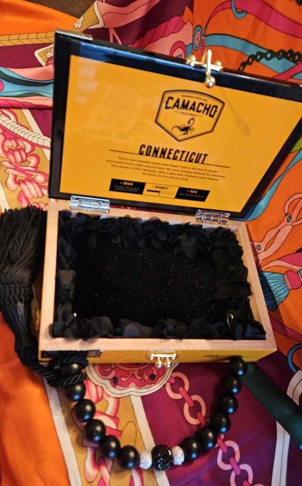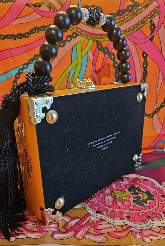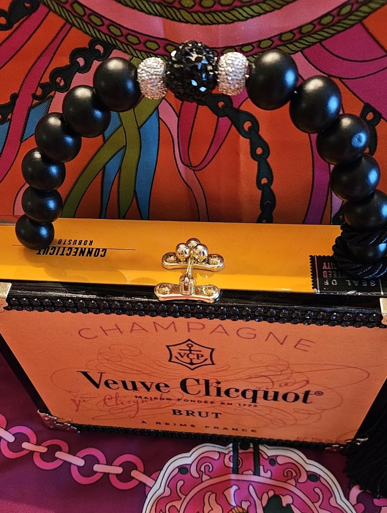 What took me so long to figure out that these Camacho, Connecticut cigar boxes were an exact match to the label on one of my favorite champagnes??? I LOVE these and I’m keeping one for myself! The image of the Veuve label has been decoupaged onto the front of the upcycled cigar box. Black bling has been added to the top and bottom for a little extra extra. The back of these boxes come from the factory in black velvet and have what they call a grand piano finish- 16 layers of lacquer. The inside has been lined with padded and plush black velvet and black petal trim. The handle has been done in all black beads and crystal beads in the center. A substantial black silk tassel further adorns the handle.